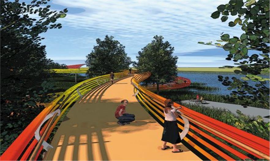 看未來(lái):一座寬5米的步行橋貫穿燕尾洲,成為欣賞公園美景的最佳平臺(tái)。它有時(shí)在水上,越過(guò)江面,高出水面6米;它有時(shí)在濕地,彎彎曲曲繞行其中;它有時(shí)在林地,原本需要仰望的樹(shù)冠突然伸手可及;有時(shí),它又在廣場(chǎng),橋體分出兩根支橋,蜿蜒降落在運(yùn)動(dòng)休閑區(qū)。