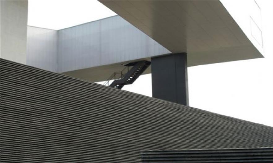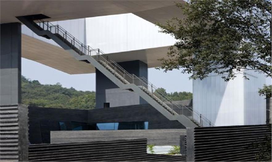 一條曲折的室外樓梯作為通往上層美術館的入口,這條樓梯被設置在白色體量外部。竹子質感的混凝土墻面限制了入口并作為下層結構的頂棚,這個體量時而升起時而下降,就好像是環(huán)繞著整個建筑的通路。