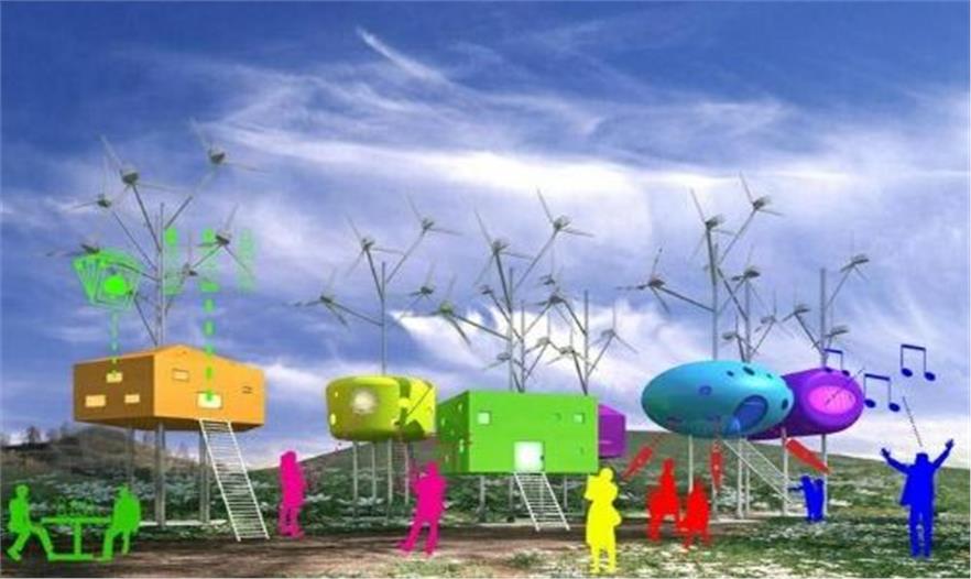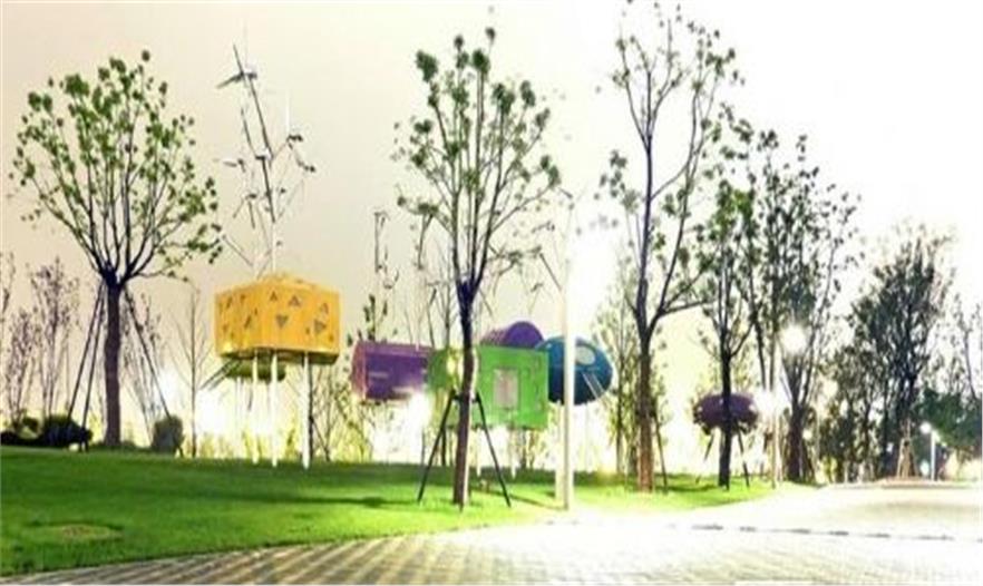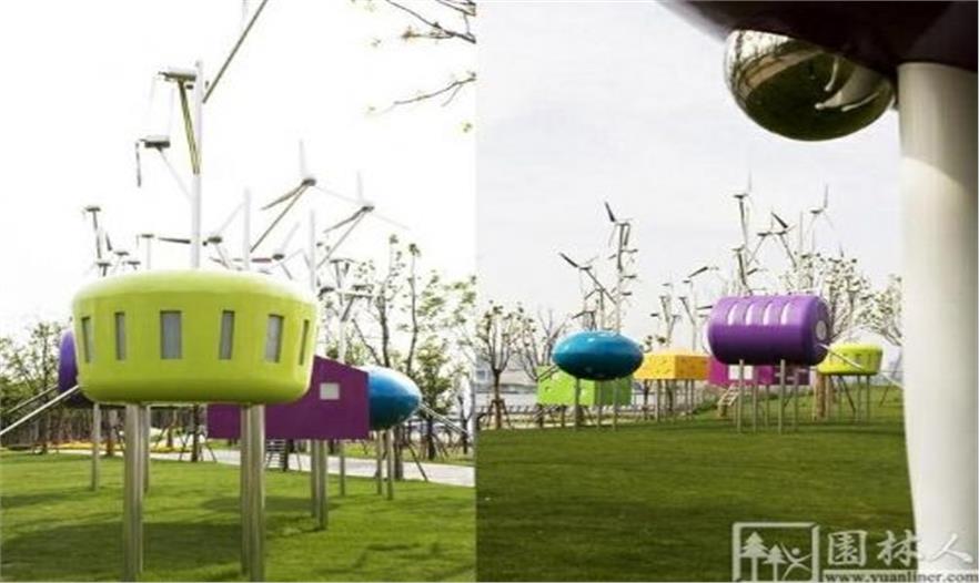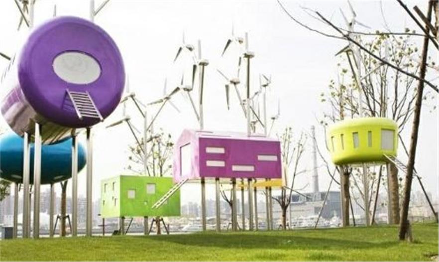 設計師參考中國古代亭臺樓閣設計的小涼亭,放在河邊,與上?;颐擅傻奶炜招纬蓪Ρ鹊氖?,這些涼亭色彩非常鮮艷,如同糖果般色彩跳耀,希望真的成為市民們的“糖果”。涼亭的頂部是風力發(fā)電機。夜晚這里又展現(xiàn)出另外一片光景。