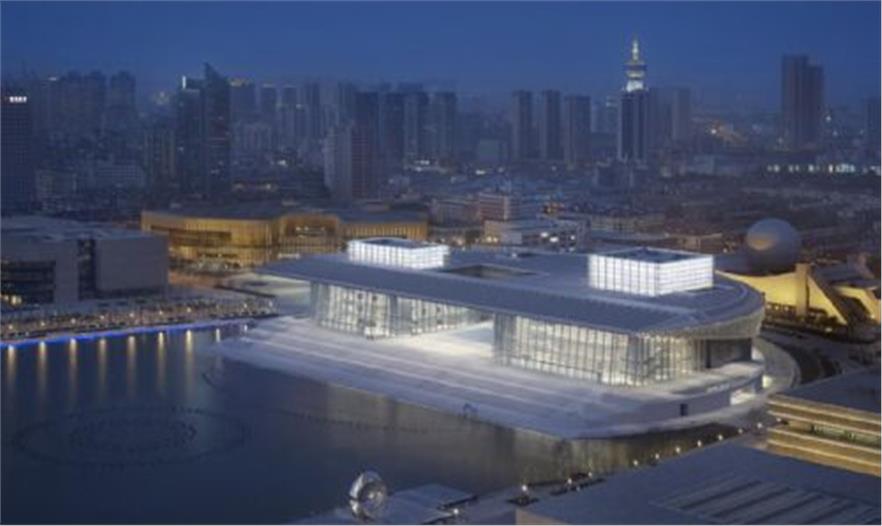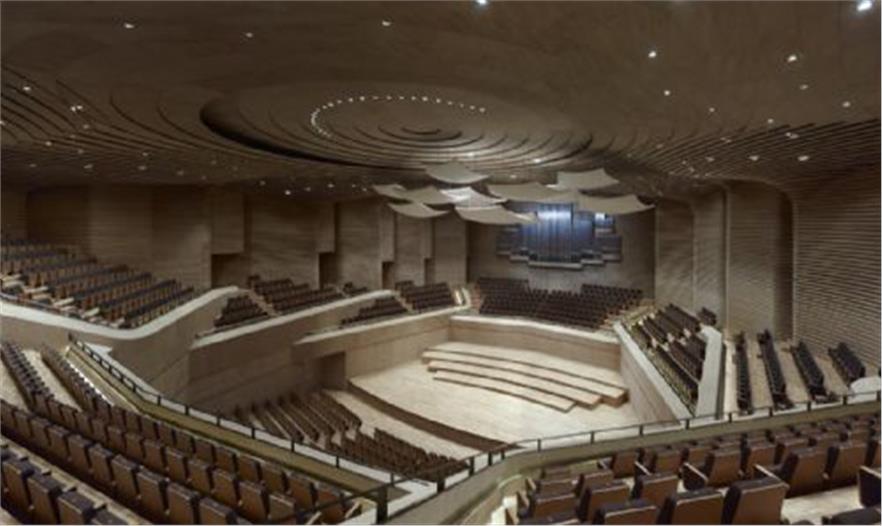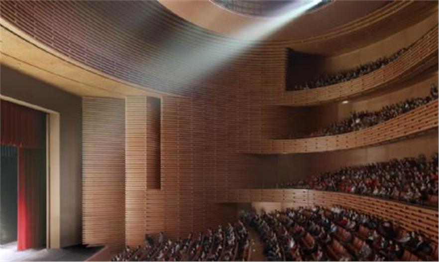大劇院屋蓋的半圓形體量朝向?qū)掗煹乃娲蜷_,宛如張開的貝殼。劇院大廳、音樂廳和多功能廳如同貝殼中璀璨的珍珠,臨水而立。