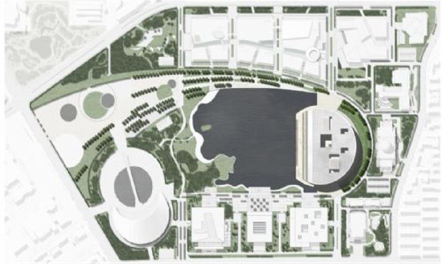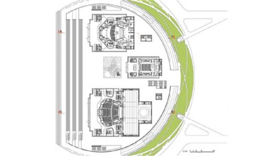 三座相互獨立的演出大廳坐落于一個石質(zhì)基座上。寬闊的臺階將人們連接了水面和高處的平臺,構(gòu)成一個上演城市生活情境的舞臺,人們可在此休憩,同時欣賞湖景,一覽文化公園全貌。
