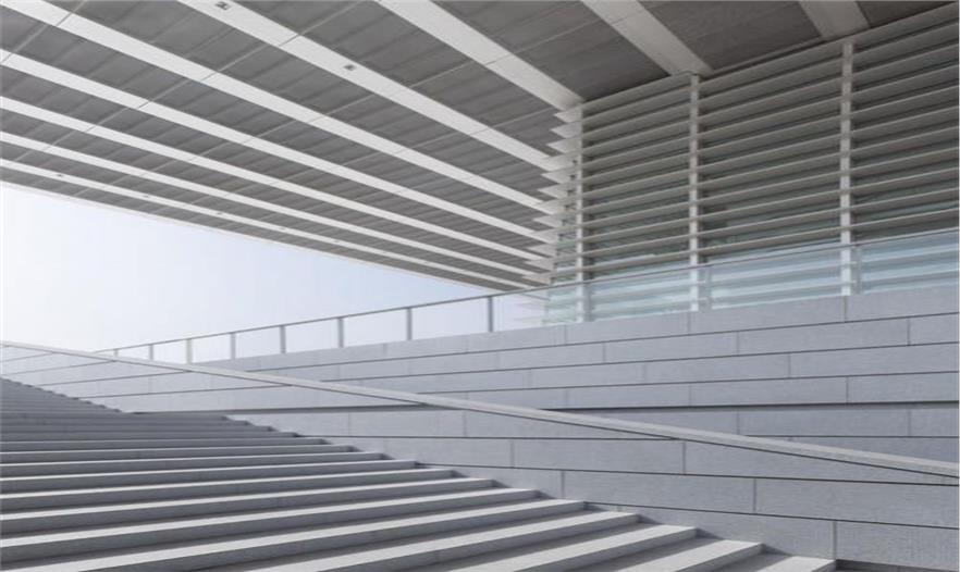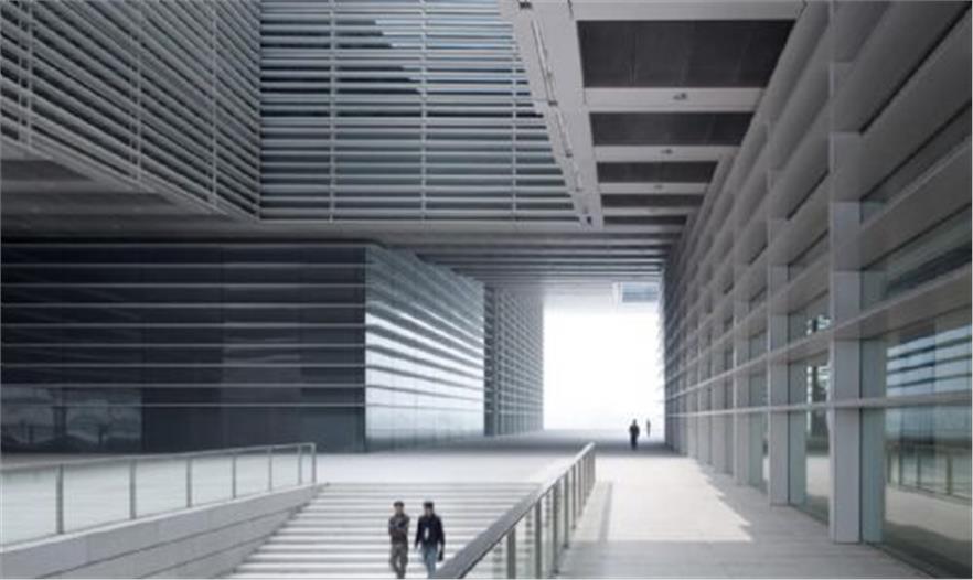 屋面結(jié)構(gòu)以富有時代感的設(shè)計語匯表達了傳統(tǒng)中式重檐廡殿頂?shù)囊庀螅⒔梃b了中國古典建筑的三段式手法,通過橫向的層次肌理,將屋面、立面、石基合為一體。