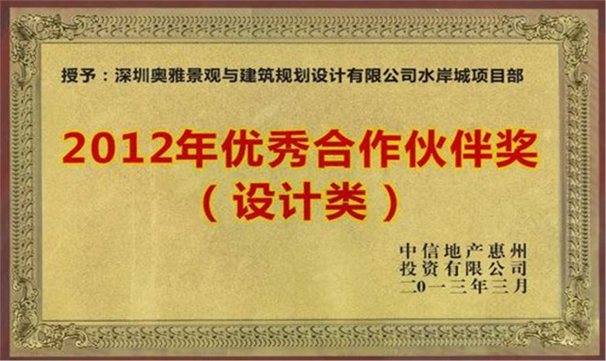 此前,奧雅設(shè)計(jì)集團(tuán)與中信地產(chǎn)在惠州中信水岸城項(xiàng)目進(jìn)行合作,負(fù)責(zé)水岸城項(xiàng)目的景觀設(shè)計(jì),設(shè)計(jì)效果突出,受到中信地產(chǎn)的高度認(rèn)可,并在此次答謝會上因?yàn)樵擁?xiàng)目的出色表現(xiàn)被評為中信地產(chǎn)2012年優(yōu)秀合作伙伴。