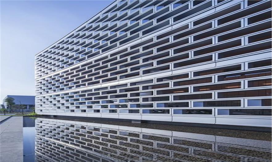 最初,圖書館立面指定采用GRC(玻璃纖維增強(qiáng)混凝土)??紤]到立面的尺寸、結(jié)構(gòu)荷載、預(yù)制結(jié)構(gòu)構(gòu)件的尺寸、當(dāng)?shù)氐恼陉栃枨蠛推渌蛩?,GRC通用化組件被設(shè)計(jì)成輕質(zhì)的高強(qiáng)度空心模塊,尺寸為1800毫米×675毫米×400毫米。模塊空心處填充經(jīng)過脫模和固化處理的保溫材料,出于多種原因,甲方在施工前要求更換材料。最終,我們選用了銀灰色的半通用化鋁模塊,將其按照錯(cuò)列的方式組合在一起。鋁模塊既防水又防曬,并按照原有的方案來組裝。十字形通廊的天花板和墻壁采用的是橘黃色的高強(qiáng)度纖維水泥板。橘黃色從室外的公共區(qū)域延伸到室內(nèi)的公共區(qū)域,邀請(qǐng)通廊中的人進(jìn)入建筑內(nèi)部。