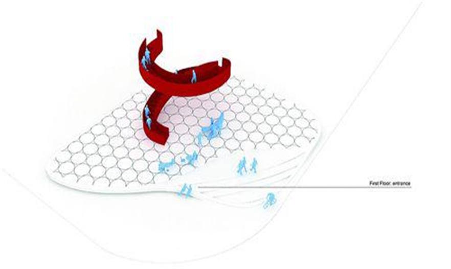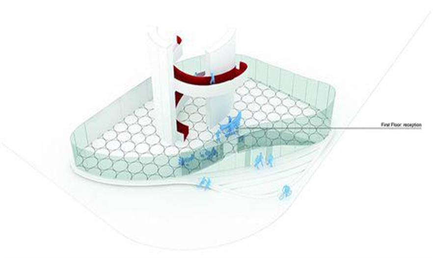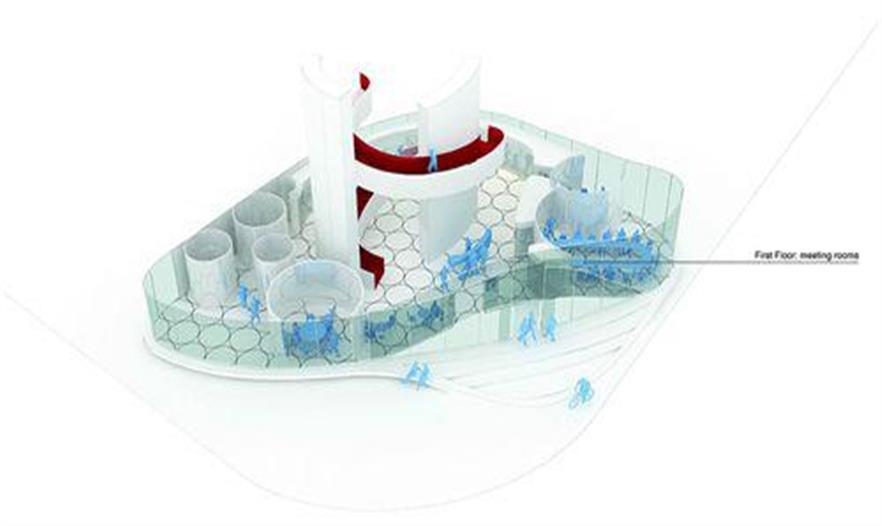 樣板房一層設有會議室、辦公室、店鋪樣板間以及紅色螺旋觀摩通道的入口。當參觀者進入樣板房的時候,圍繞在他身邊的正是玻璃材質的商鋪樣板間外立面,這也能夠使他立即感受到未來商場的商業(yè)氣氛。中庭寓意著未來商場的公共開放空間。