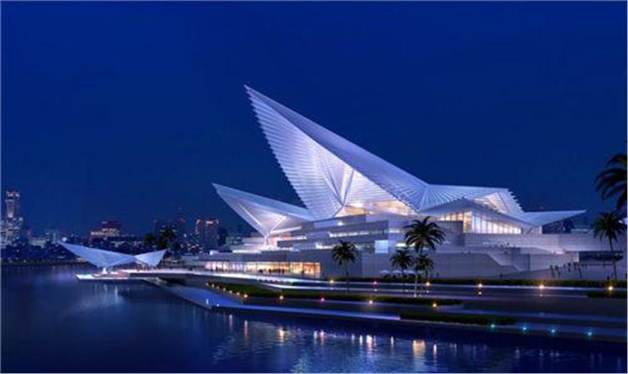 建筑造型獨具匠心,基座猶如層層疊疊的梯田,蜿蜒奔放猶如人龍共舞;屋頂如葉似帆,如傘似扇,從海邊宛如層巖的基座上蓬勃而出,又如鯤鵬展翅,還如紫荊綻放。