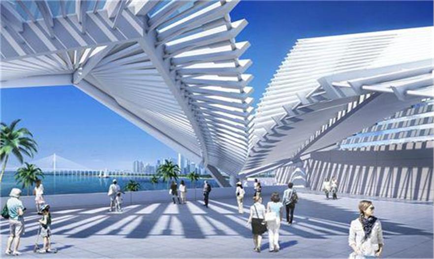 建筑形式明快而沉穩(wěn),精致而大氣,典雅而豪邁,五大功能排列組合,行程連綿起伏、錯落有致的以文化藝術(shù)為主題的生態(tài)濱海公園,文化中心與整體環(huán)境共同營造出聞濤起舞、舞動南海的意境。