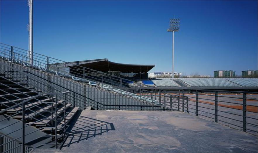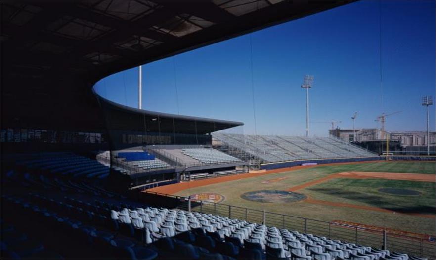 五棵松棒球場是第29屆奧運會棒球比賽的主賽場,為臨時建筑,奧運會之后拆除,還原為供百姓日常進行文體活動的區(qū)域。五棵松棒球場共有15000個座席,在國際棒聯(lián)的強烈要求下將其分為12000座(1#)和3000座(2#)兩個棒球場,與訓(xùn)練場一起三個場地由南向北線性排布,全部采用鋼結(jié)構(gòu)建造。1#、2#場地包含運動員、裁判、賽事管理、VIP、媒體及安保等各類奧運比賽所需的功能用房,關(guān)系復(fù)雜。鑒于奧運會的比賽要求,棒球場雖為臨時建筑,但其比賽場地及比賽設(shè)施是世界一流的,專業(yè)的草和紅土花費了大量的財力,每個場地周圍配備的6根高桿投光燈保證了比賽的照度需求,但它的臨時性決定了建筑必須是節(jié)儉的,盡可能采用成熟技術(shù)、簡單工藝及經(jīng)濟材料。布局上平層分流,觀眾和特殊人員的流線交叉通過運營管理手段解決。不設(shè)電梯,殘疾人通過殘疾人坡道式輪椅爬樓車到達指定位置。結(jié)構(gòu)設(shè)計上選擇鋼結(jié)構(gòu),保證了拆卸的便捷及材料的持續(xù)性,12000座棒球場70%看臺租用專業(yè)腳手架臨時搭設(shè),配備低靠背硬塑座椅。計時計分顯示屏及頒獎臺升降旗等大量運動工藝設(shè)施賽前臨時租用,大大降低了造價。