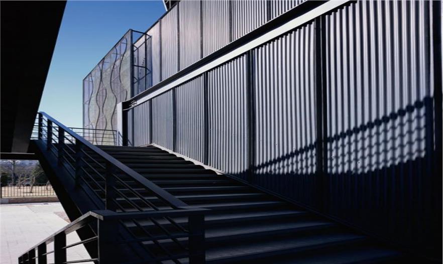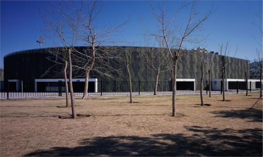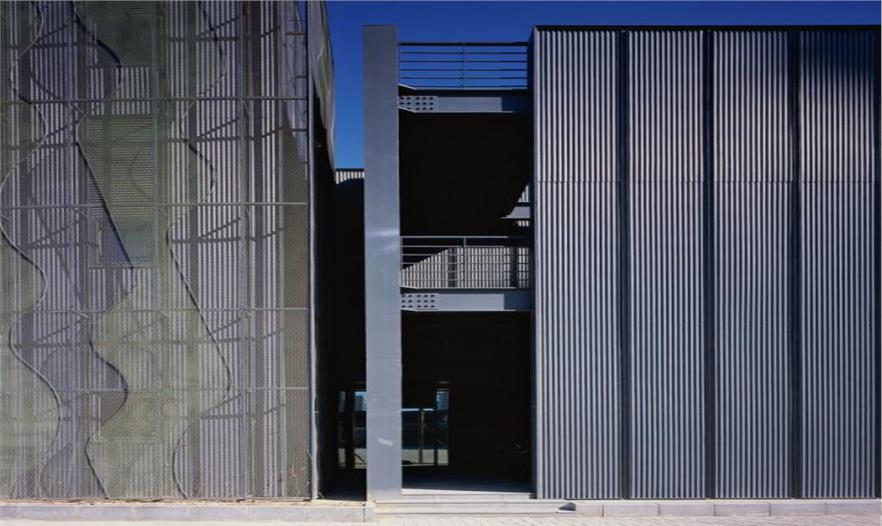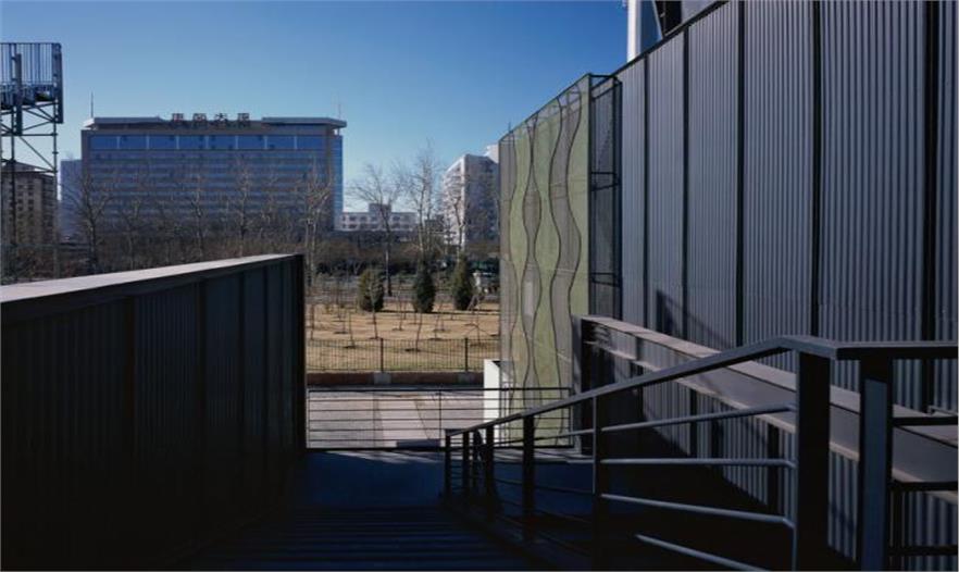 五棵松文化體育中心內(nèi)的重心是籃球館,因此棒球場采用“隱”的設(shè)計手法,在深灰色建筑外墻外局部罩一層疏密相間的金屬網(wǎng),通過綠色的變化肌理形成迷彩外衣,做為綠色藤蔓植物的依附物,這樣棒球場在夏季奧運會來臨之際將會融入郁郁蔥蔥的綠色環(huán)境之中,達到和諧自然的目的。