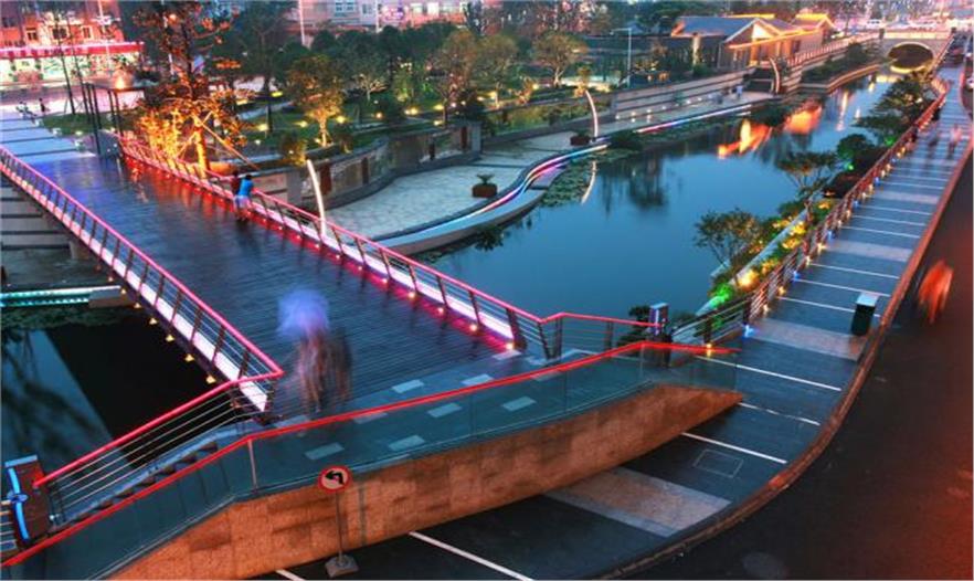 基于現(xiàn)代簡(jiǎn)約風(fēng)格,城河和谷瀆港的改造洋溢著的濃厚的水鄉(xiāng)風(fēng)貌隨處可見。設(shè)計(jì)師利用亭和墻來臆測(cè)長(zhǎng)江人民在江南生活特有的風(fēng)景。老楊舍鎮(zhèn)人民最熟悉的青龍橋被修復(fù)。青龍橋,龍吟,谷瀆港潮的聲音,青香閣,竹筏碼頭,船舶碼頭,濟(jì)陽城墻、“八禁”碑和老楊舍鎮(zhèn)的歷史八個(gè)原始文化元素,別出心裁地點(diǎn)綴在谷瀆港河兩岸,創(chuàng)造出了濱水人文景觀的特色。