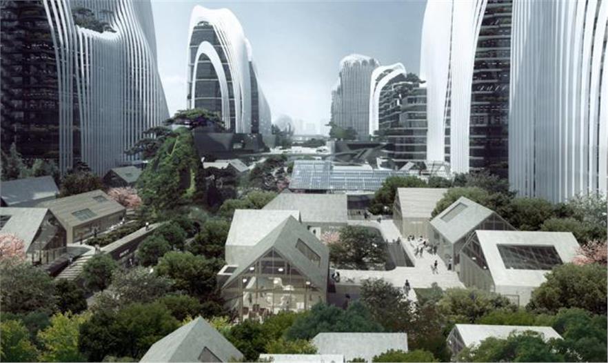 基地的中心區(qū)域由一些散落在綠毯上的坡頂小屋構(gòu)成,呈現(xiàn)出小村落式的環(huán)境,為大尺度的城市項(xiàng)目提供了宜人的城市空間。小橋連接著村落,從一個(gè)街區(qū)到另一個(gè)街區(qū),串聯(lián)了假山、流水,構(gòu)成了一幅充滿詩(shī)意的畫(huà)作。建筑采用混凝土作為材料,表現(xiàn)出材質(zhì)本身的樸素。