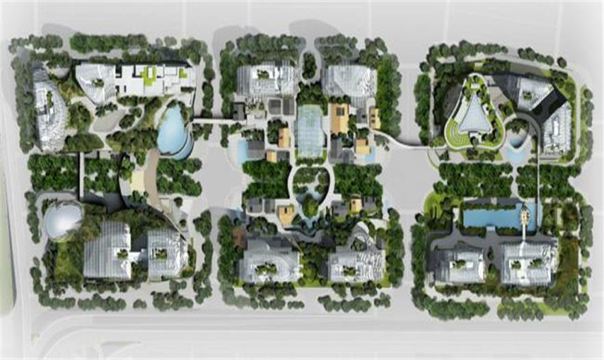 項(xiàng)目基地由六個(gè)地塊組成,其中兩個(gè)街區(qū)被一座立體城市廣場(chǎng)連接。不同尺度的連廊、走道穿插在幾個(gè)連綿起伏的商業(yè)綜合體中,引領(lǐng)人們從繁忙的地面街道漫步到立體公園,游走于建筑與景觀之間。