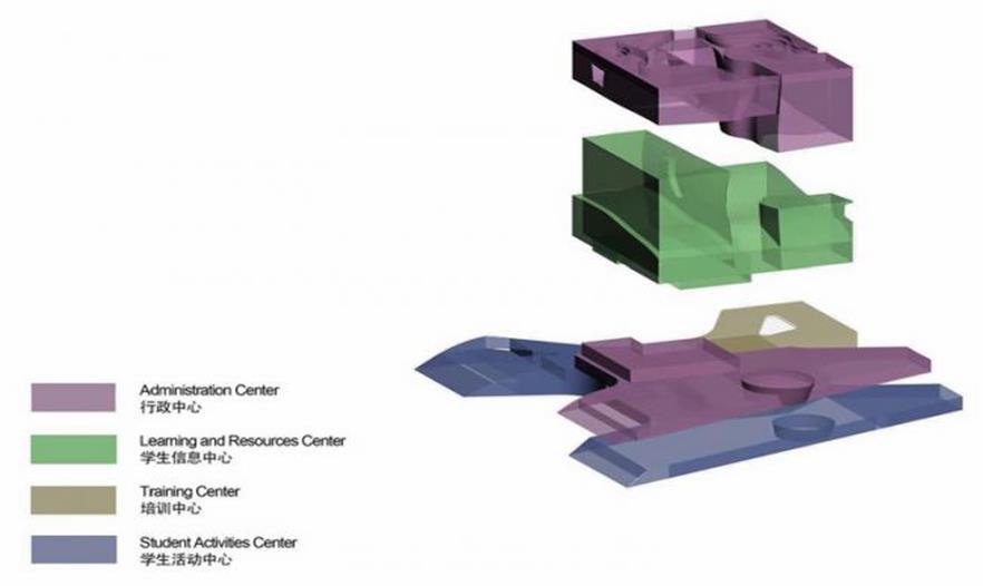 太湖石的多孔屬性被轉(zhuǎn)化成虛體結(jié)構(gòu),功能空間連接大樓內(nèi)不同的單元,包括一個(gè)行政中心、一個(gè)學(xué)習(xí)和資源中心、一個(gè)訓(xùn)練中心和一個(gè)學(xué)生活動中心。虛體空間還使建筑得以回應(yīng)用戶和周圍文脈,將它轉(zhuǎn)化成為一個(gè)互動容器。虛體空間高度各異,在建筑內(nèi)創(chuàng)造了一個(gè)三維的蘇州園林,并為引入自然采光和通風(fēng)等可持續(xù)因素創(chuàng)造了條件。