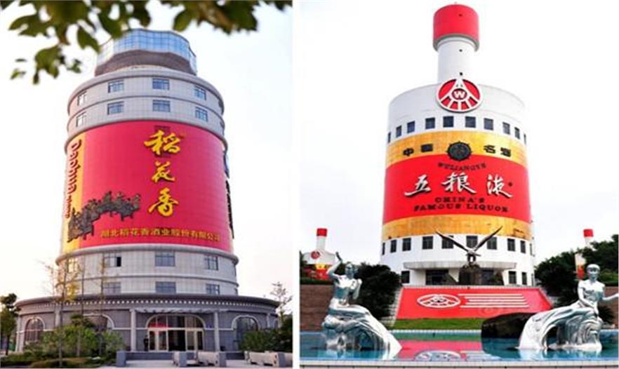 2012年11月1日,湖北省宜昌市夷陵區(qū)稻花香集團(tuán)廠區(qū)內(nèi)“酒瓶”形狀的辦公大樓(左),五糧液集團(tuán)廠區(qū)內(nèi)“酒瓶”形狀的辦公大樓(右)。(拼圖)