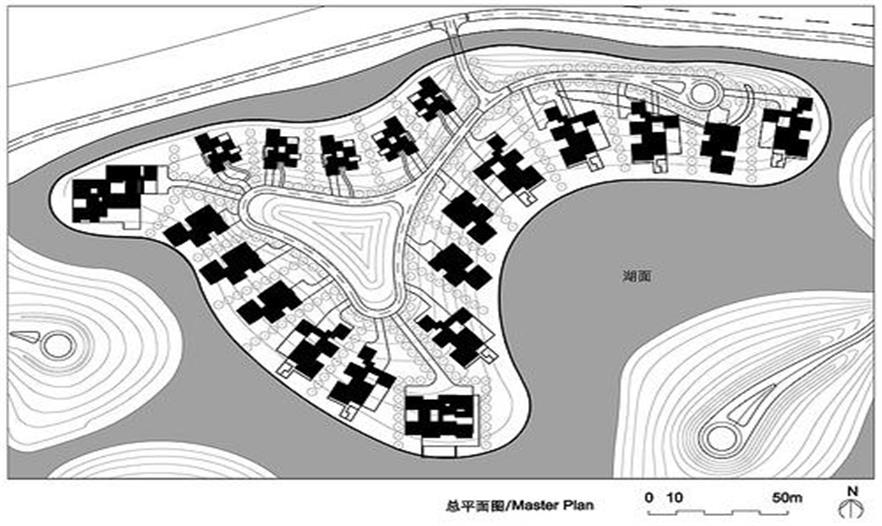 張永和用思辨的方法,重新詮釋、分配、組合中國傳統(tǒng)規(guī)劃概念中的“分”、“院”、“園”,設(shè)計了上海青浦區(qū)涵璧灣花園別墅。其解為: