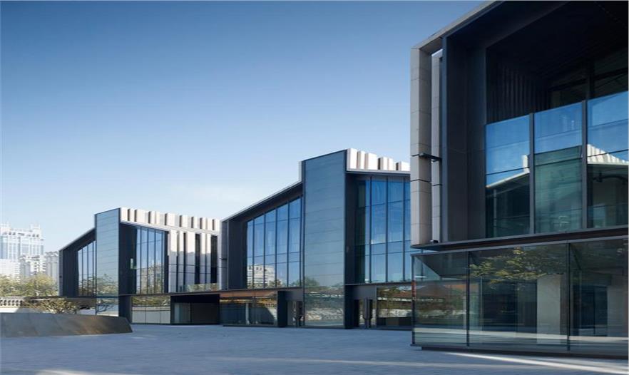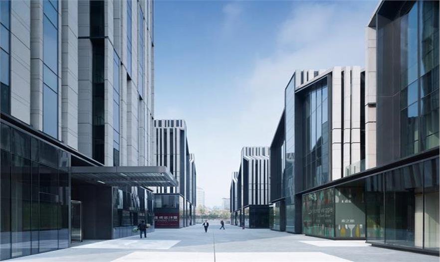 建筑的幕墻與屋面采用了淺色并寬窄不一的天然石材條形飾面板。與淺色條帶裝飾形成鮮明對(duì)比的是玻璃幕墻的深色金屬框架。建筑群回避了一味仿古懷舊的建筑語(yǔ)匯,塑造了如同抽象畫般的幕墻形象,強(qiáng)調(diào)了上海內(nèi)環(huán)核心區(qū)的都市感和現(xiàn)代性。