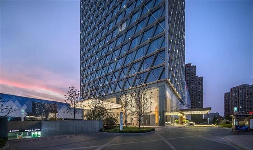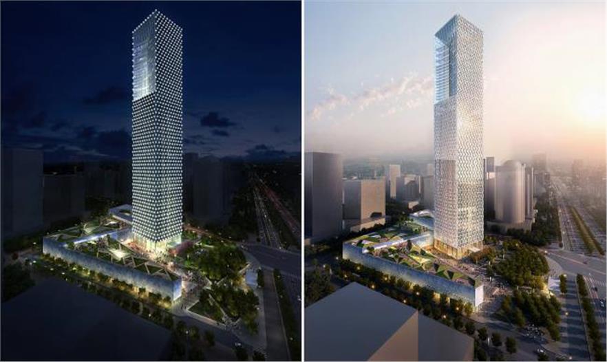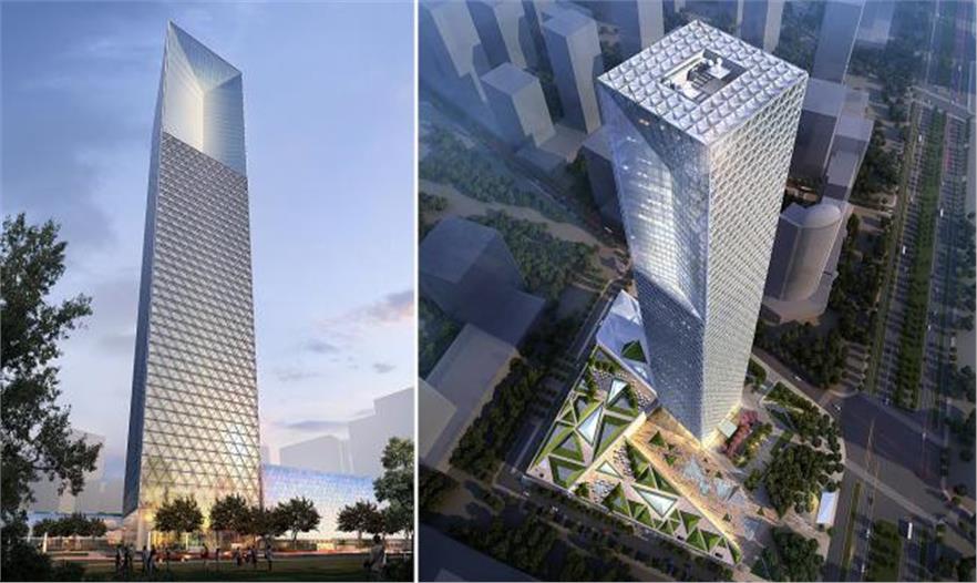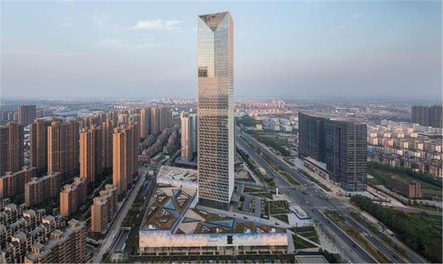 這座摩天大樓呈優(yōu)雅的幾何形。呈斜面的“大窗”位于建筑立面的上部,占據(jù)了整個(gè)立面的三分之一,朝向西面的南昌老城。大廈的四面覆蓋著三角形遮陽板,不僅呈現(xiàn)出獨(dú)特的質(zhì)感,還有助于通過降低熱量吸收使建筑性能更佳。