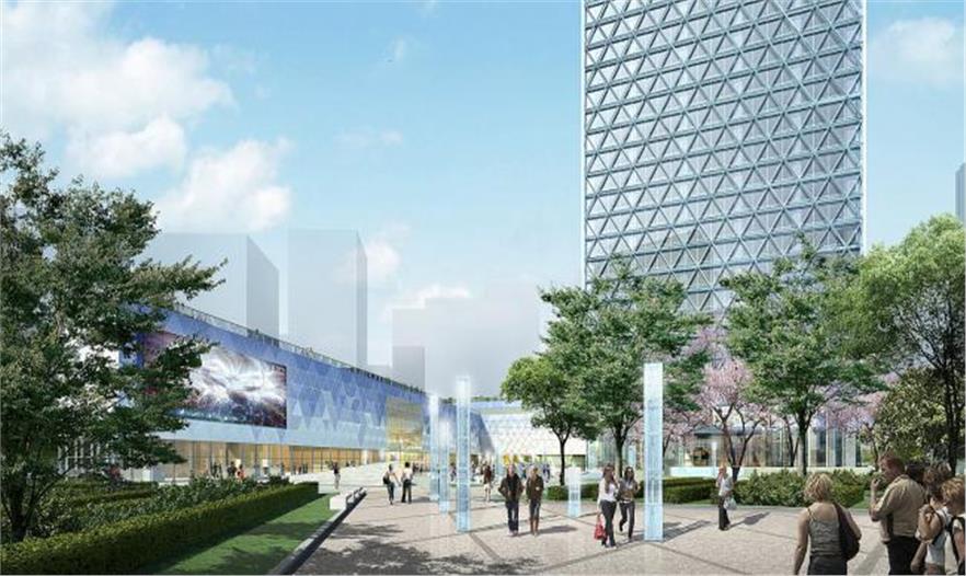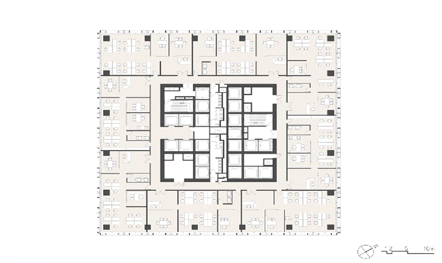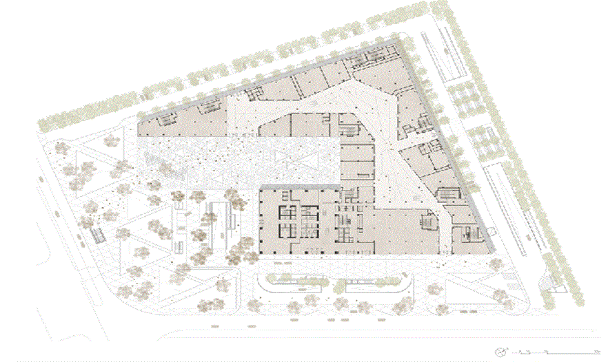 地面層有一個(gè)巨大的公共庭院,為行人、辦公租戶和酒店客人提供了各種各樣的活動(dòng)空間。大廈的裙樓設(shè)有商業(yè)空間,裙樓屋頂上是優(yōu)美的戶外露臺(tái),擁有壯觀的景致視野。