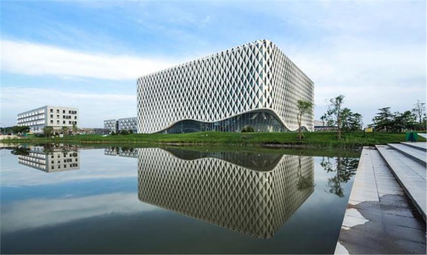 建筑方正的體量感體現(xiàn)了對校園整體規(guī)劃的尊重態(tài)度,強化出匯聚之勢;同時底部經(jīng)過沖切,將方形建筑體量柔化成優(yōu)美的曲線,輕輕地漂浮在水面之上,猶如一個精致神秘的藏寶盒從水中升騰,成了整個校區(qū)的視覺中心。
