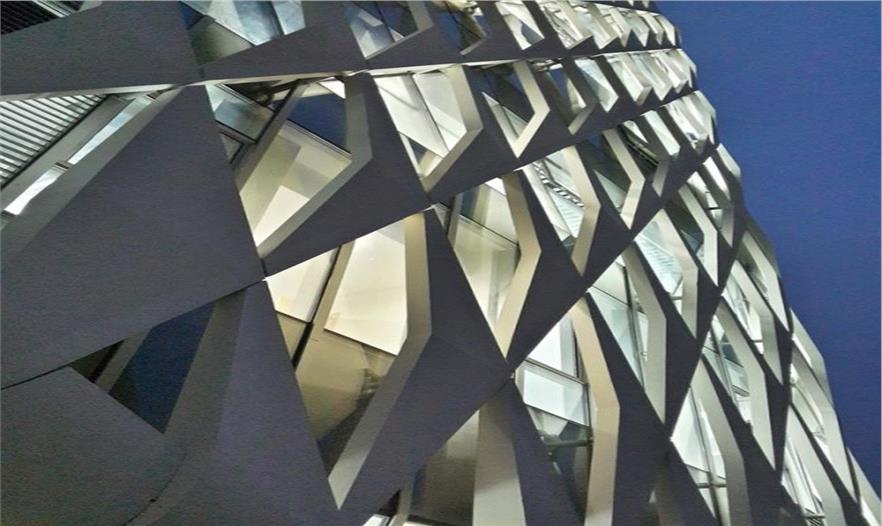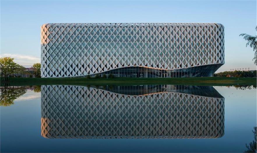 建筑的上部立面采用了雙層表皮,玻璃幕墻之外以菱形交匯的GRC網(wǎng)格包覆,使建筑猶如一件鏤空的藏寶盒,朦朧而婉約,菱形網(wǎng)格的圖案又抽象地對傳統(tǒng)建筑漏窗進行了現(xiàn)代詮釋。在連續(xù)均質(zhì)統(tǒng)一的菱形網(wǎng)格模數(shù)之中,根據(jù)不同朝向的日照及遮陽要求,融入中國傳統(tǒng)五行的抽象圖解,不同的立面變幻出各異的圖案,疏密有致。這些符號是對建筑物本身文化背景的闡述,同時也表達了信息時代特有的審美取向。在陽光最強烈的時候,這層網(wǎng)格就成了屏蔽直射光的有效屏障,而被GRC網(wǎng)格捕捉到的陽光從間隙灑入室內(nèi),斑駁成影。為空間增加了生動活潑的氣氛。 新材料的使用為建筑注入了時代的氣息,更使建筑成為一個空靈,雅致的當代藝術(shù)品。