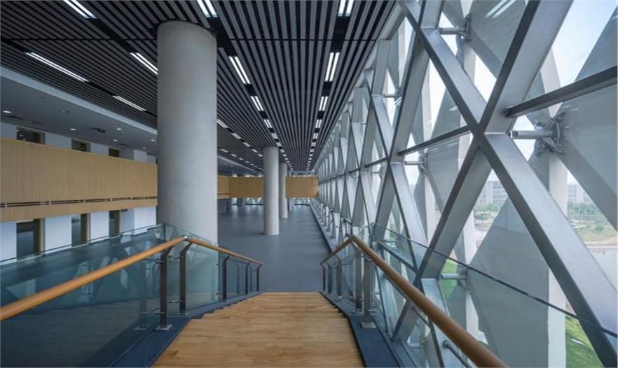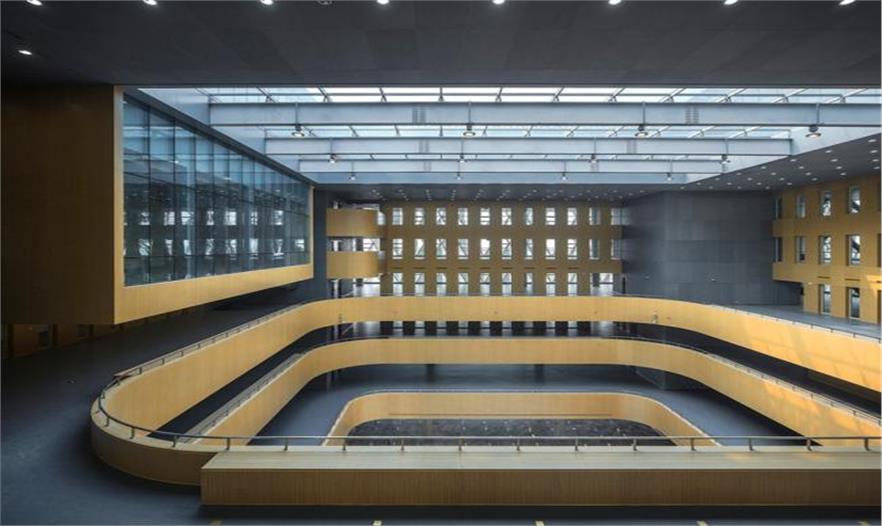 在內(nèi)部空間的設計上,靈活性與多變性是設計的核心元素。圖書館本身是個“朝天空開放的盒子”,玻璃屋面之下的白色玻璃纖維布使天空穩(wěn)定的入射光線變得柔和,從上而下擴散至每層樓面。垂直交通和輔助功能用房被高度集中地設置在四組核心筒之中,閱覽空間得以自由開放地環(huán)繞中庭布置,與共享空間層層疊加、跌落,烘托出懷抱和聚集的氣氛。質(zhì)感溫和的淺色木質(zhì)書架和閱覽桌椅與清水混凝土的核心筒飾面營造出清新淡雅的室內(nèi)氣氛。底層開放性的中央大廳,采用青磚鋪地及主題墻,體現(xiàn)對北京當?shù)貍鹘y(tǒng)尊重態(tài)度。