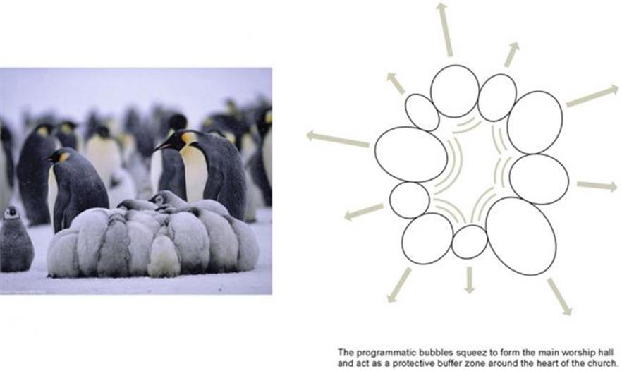 新教堂的主要功能,除主禮拜堂之外,都被安置進(jìn)十個(gè)蛋形的不同大小的體量里。體量的高度根據(jù)功能的不同,從一層到三層不等。這些體量聚合在一起,主禮拜堂位于它們的中間,這樣的布局使后者具有了神圣的庇護(hù)的氣氛。其中一個(gè)蛋形體量被留作主禮拜堂的講臺(tái),透過(guò)它的窗戶,自然光可以進(jìn)來(lái),里邊的人能看到湖面的景色。其他的體量則作為中心與外界的緩沖區(qū)。整個(gè)造型很像企鵝聚攏在一起的樣子。