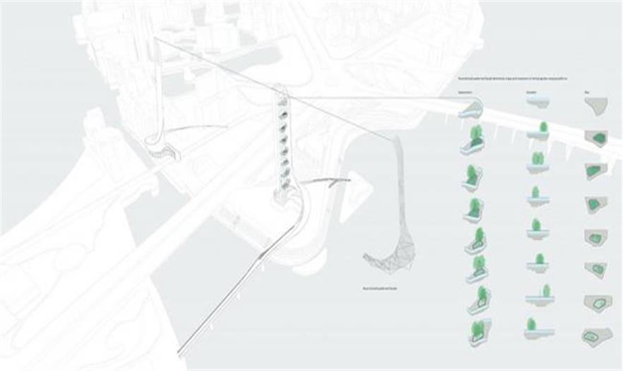 景觀塔不應(yīng)該是一個孤立的個體,它與公園空間環(huán)境之間的關(guān)系不是“割裂”而是“共存”。三條張弛有力的曲線從東、西、北三個方向飛馳而來,輕盈地掠過湖面,共同盤旋上升,直沖云霄;筆直的塔身與旋轉(zhuǎn)的曲面相結(jié)合,剛硬又不失優(yōu)雅。 北線和東線取代了當(dāng)前公園方案中的簡易浮橋,鋼筋混凝土鑄造的橋身與主塔融為一體,渾然天成;它們同時也為人們直達塔座二層的休閑咖啡廳與餐廳提供了捷徑。