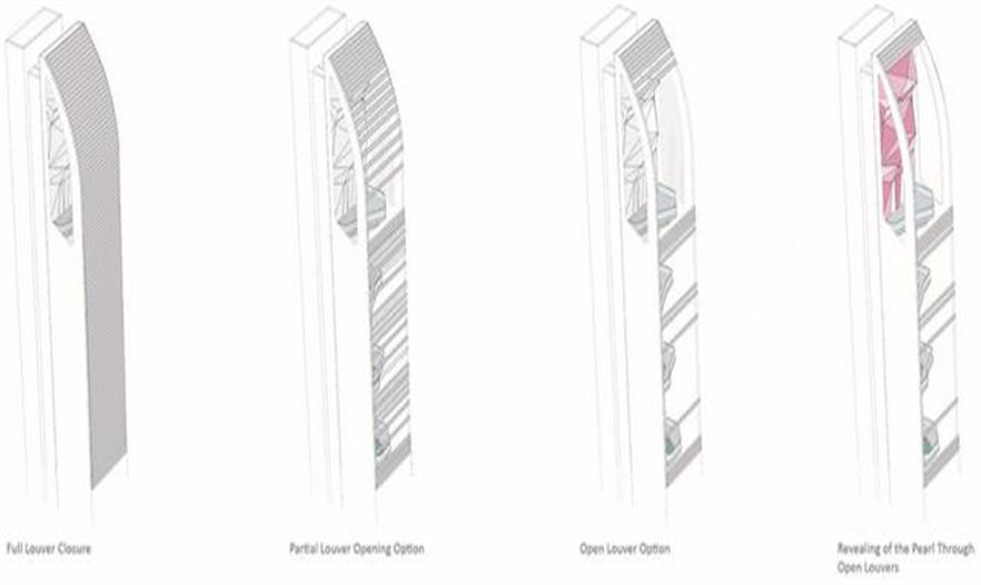 WVA借鑒中國傳統(tǒng)古塔的設(shè)計經(jīng)驗,除了在100米的高空提供一個面向尖峰山、河道兩岸和井岸城區(qū)主要方向的觀景平臺之外,由上至下每間隔10米均設(shè)有一個微縮的空中庭院;仿照古塔的游覽習(xí)慣,人們可以選擇在不同高度的空中停留,獲得豐富的景觀體驗;開敞的樓梯間被金屬網(wǎng)和LED燈帶包裹著面向白蕉路,流動閃爍仿佛光的波濤,在夜幕降臨后吸引人們在此聚集。