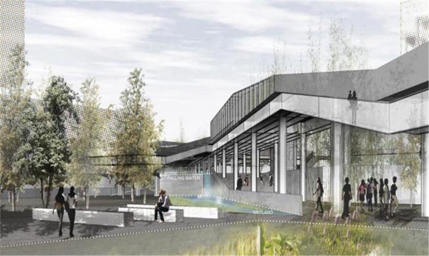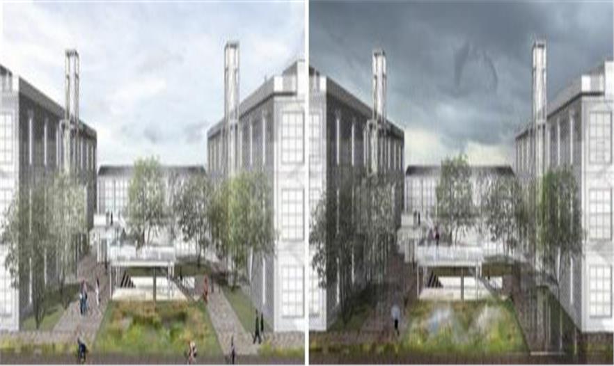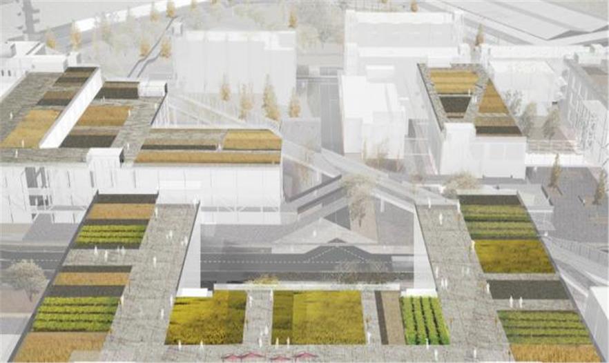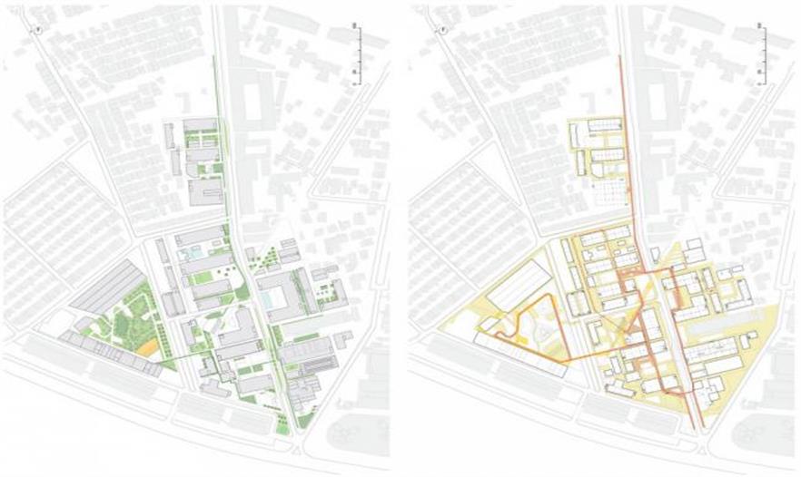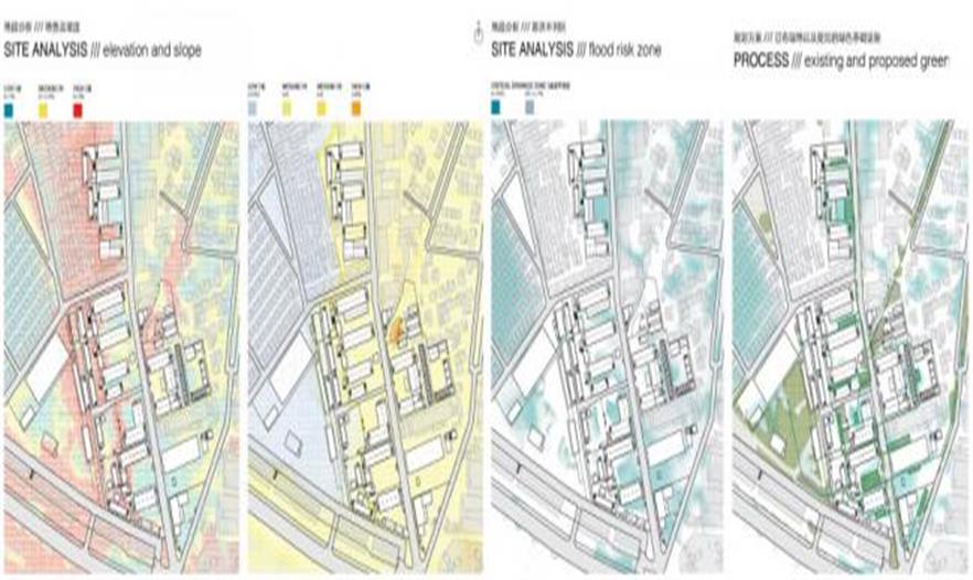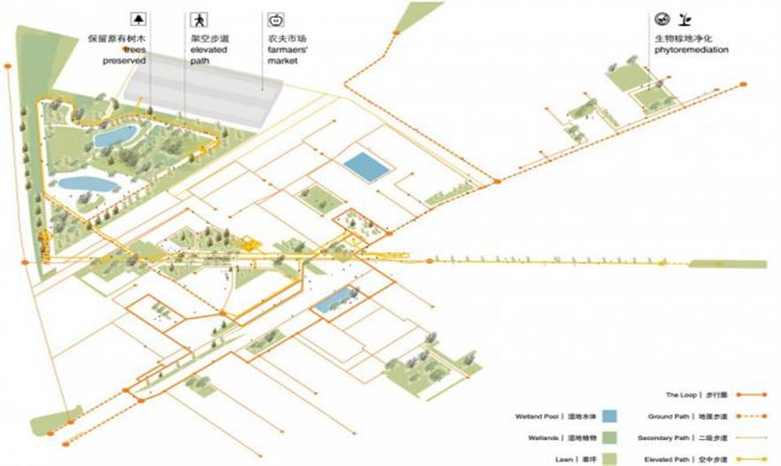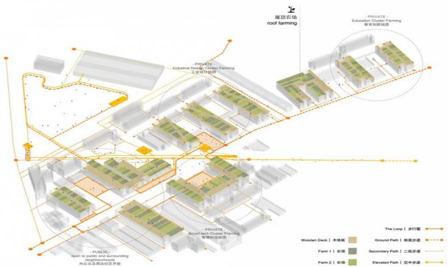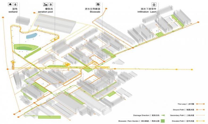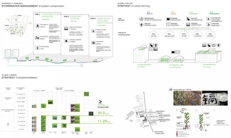 整合了雨水管理、棕地植物凈化和都市農(nóng)業(yè)的生態(tài)策略作為整個公共空間再造的驅動力之一,在不同高度和層次上展開。廠區(qū)內(nèi)地勢平坦,方案因而從高程分析出發(fā),在排水不利的高洪澇風險區(qū)引入以生物廊道相連的雨洪花園和下滲地面,減少短歷時強降雨的雨水外排量而降低對市政排水系統(tǒng)造成的壓力,從而整體實現(xiàn)低影響開發(fā)。同時,這個連貫一體的雨水管理系統(tǒng)可以收集并凈化雨水以供植物灌溉所用。棕地植物凈化策略利用植物本身的自凈功能分階段處理不同區(qū)域因幾十年工業(yè)活動(電子,皮革及制作)所帶來的土壤污染。在地面土壤得到充分凈化前,一系列社區(qū)農(nóng)業(yè)將在建筑屋面安全的土壤環(huán)境開展。整體的綠色基礎設施設計不僅回應了作為棕地的舊工業(yè)區(qū)在環(huán)境方面提出的額外挑戰(zhàn),也將同時為室外公共空間提供豐富多樣的體驗,這將構成該園區(qū)獨一無二的特質(zhì)之一。