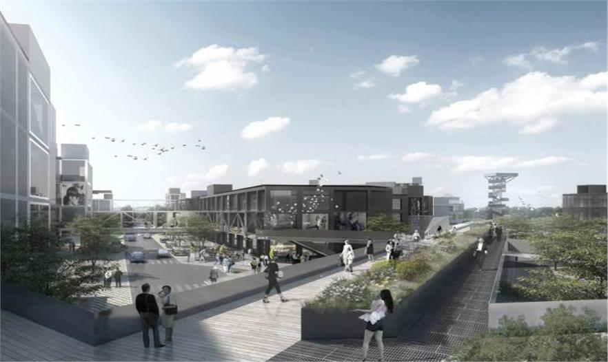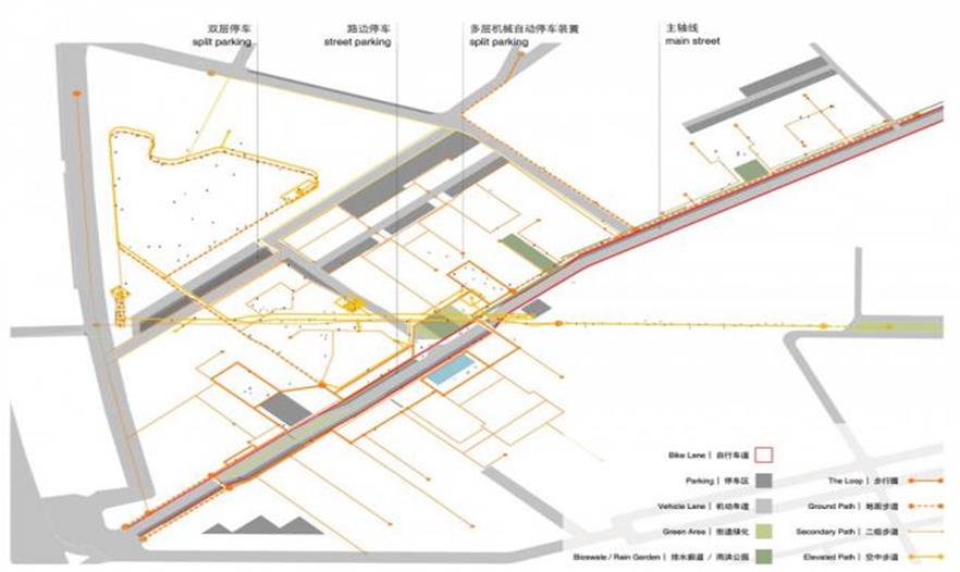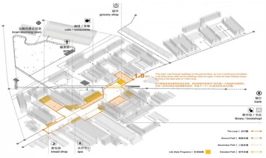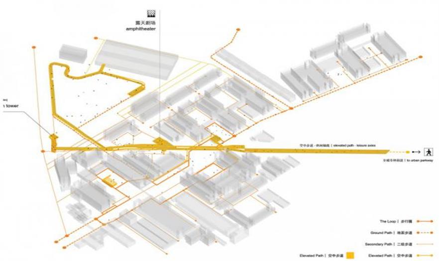 步行可達性和體驗的提升也是該方案的重要目標之一。方案提出的“步行圈”穿越單體建筑的商業(yè)首層,即使在商場關門后仍是一個連續(xù)的步道系統(tǒng)。為支持大部分使用者將在園區(qū)同時工作和居住的特殊模式,它將一系列日常生活商鋪(咖啡廳,健身房,便利店等)聯(lián)系起來,形成了一個1.0公里的生活方式圈,是貫通整個園區(qū)的重要空間線索。同時,因其聯(lián)通原本被建筑體量打斷的各個小廣場而提供了更加連貫通暢的步行體驗。斜穿整個園區(qū)的架空布道則是一個多層次的步行公共空間網(wǎng)絡,將一系列可以開展自發(fā)會議和頭腦風暴的露天劇場、休息區(qū)等場所串聯(lián)在一起,意在為促進跨學科領域的合作和交流創(chuàng)造環(huán)境。它同時激活了二層的商業(yè)界面,并指向位于西南側公園的觀景塔和公園叢林步道。此外,為提供更為步行友善的街景環(huán)境,貫穿場地南北四車道的主路被轉化為雙車道的慢速軸線。蜿蜒的車道與步行鋪地、自行車道、停車、生物廊道交織在一起, 形成更為豐富有活力的步行體驗街區(qū)。