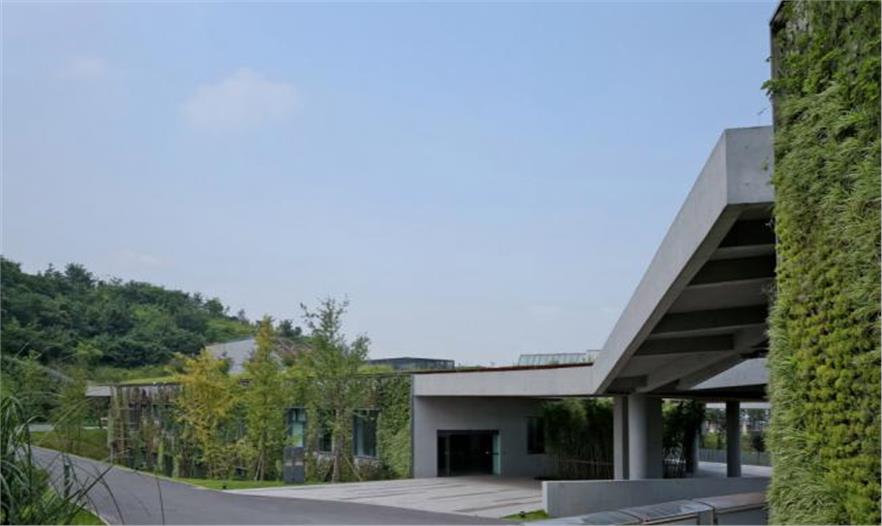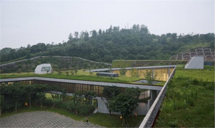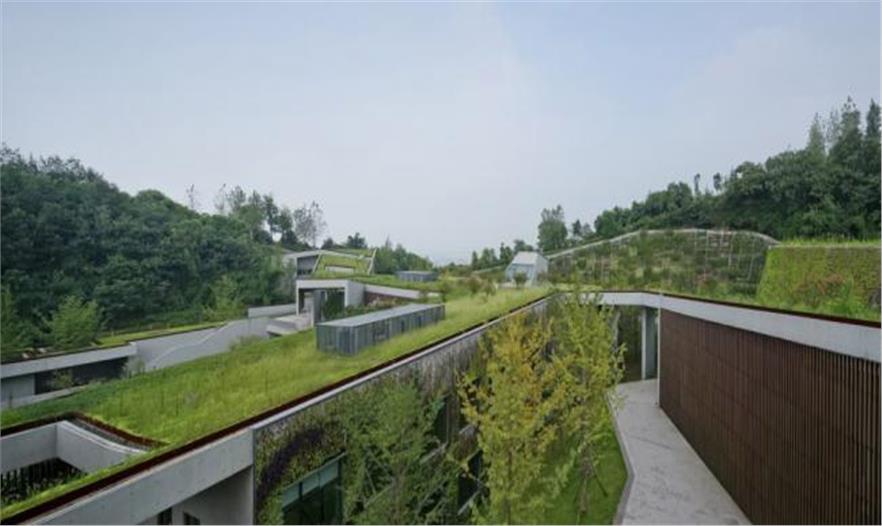 整體建筑采用綠色植被屋頂和局部的垂直綠化墻體,進(jìn)一步強(qiáng)化了建筑與自然山體共存的想法。