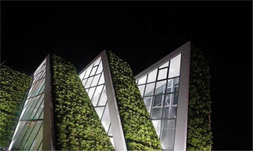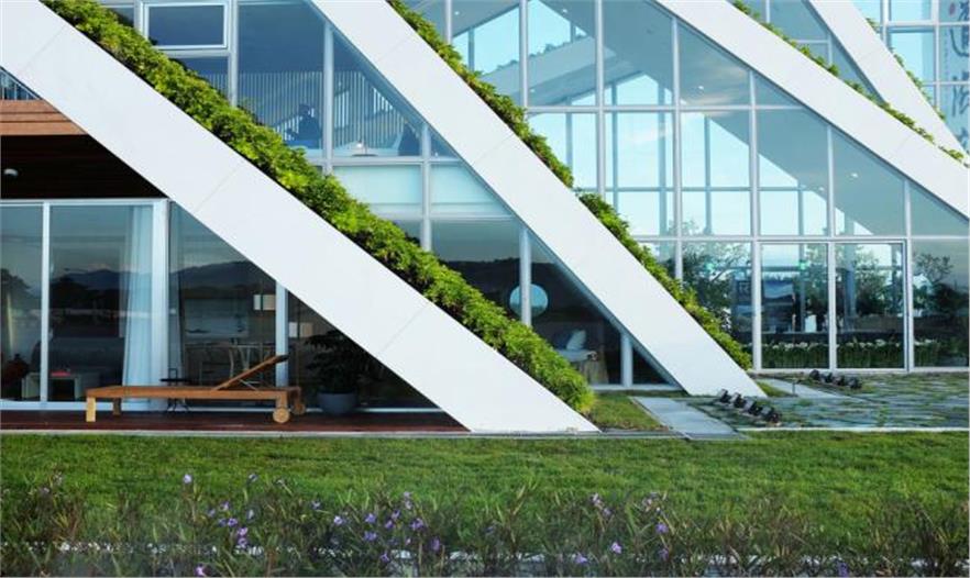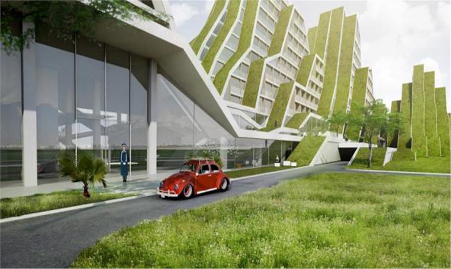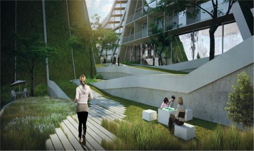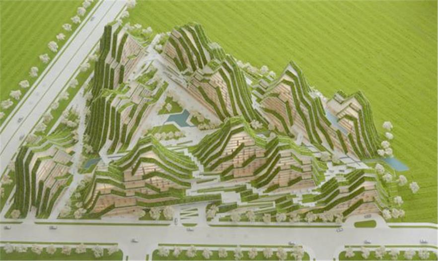總體規(guī)劃中,以綠色景觀帶為意向,與自然背景相呼應,BIG設計了一座集商用與公寓為一體的山形景觀建筑:條形體量從東向西延伸,造型優(yōu)美,同時也為臺灣濕熱的氣候提供理想的遮陰系統(tǒng)——早上和傍晚,能有效阻止太陽角度過低造成的炫光,同時南北向的光能夠進入各個建筑單元。綠色屋頂系統(tǒng)能進一步減少建筑對熱量的獲取,與條形的體量相結(jié)合,創(chuàng)造一個低能耗的建筑項目。