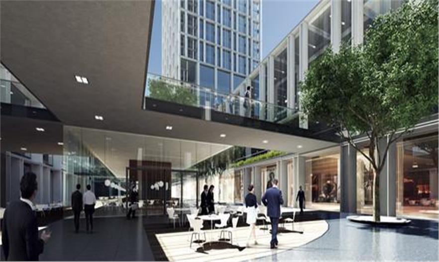 建設(shè)基地位于寶龍工業(yè)園區(qū)內(nèi),周邊街道將其切割為規(guī)整的矩形街塊,其上坐落三棟通過基座相連的高 層建筑,中心部分為綠色庭院。庭院內(nèi)布置棕櫚樹和竹林,分布在兩層之上的綠化景觀構(gòu)成整個設(shè)計(jì)的空間 核心并營造出獨(dú)特的氛圍,同時道路設(shè)置將地塊與公共空間緊密相連。三棟高層建筑前廳通過寬敞的室外階 梯溝通,階梯通向內(nèi)庭院層面,其下設(shè)有功能空間和交通網(wǎng)絡(luò),包括一座公交車站,接駁員工通勤?;?上為三層高的環(huán)形裙樓,連接了三棟高層建筑。裙樓內(nèi)設(shè)有餐廳、會議中心以及公共活動空間,如同一座連 廊,在空間上環(huán)繞圍合中心的綠色庭院。裙樓屋面將規(guī)劃為綠色屋面,地塊內(nèi)景觀錯落有致層次豐富,為高 層建筑內(nèi)的辦公空間和實(shí)驗(yàn)室創(chuàng)造絕佳的視野。