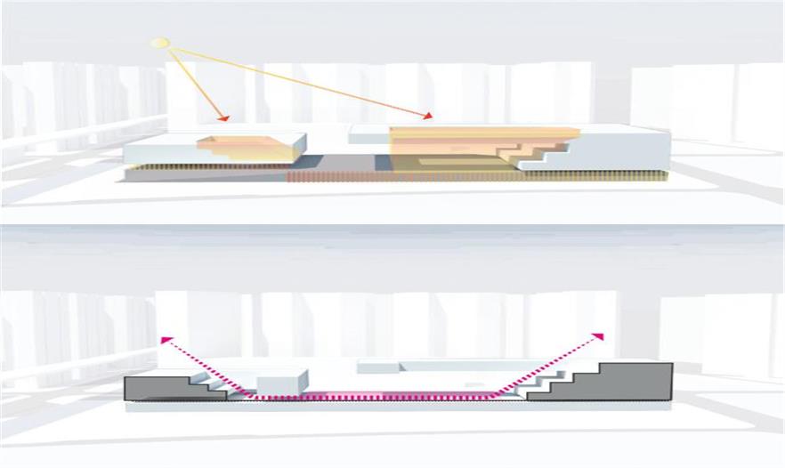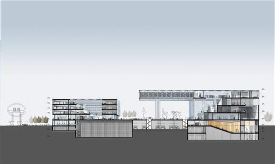圖書館和美術(shù)館基座面積均為80x80米。圖書館閱覽室共4層,可提供約1000個(gè)座位,閱覽室上方的大天窗提供自然采光。底層和地下室為檔案館。美術(shù)館屋頂出挑約66米,定義出了文化廣場的空間。在建筑實(shí)體墻的外側(cè)采用了磨砂玻璃作為飾面突出了建筑的整體性,兩者之間保持了一定的空間可避免過多熱能進(jìn)入內(nèi)部,為建筑節(jié)能帶來有利條件, 同時(shí)也使建筑立面更加立體。