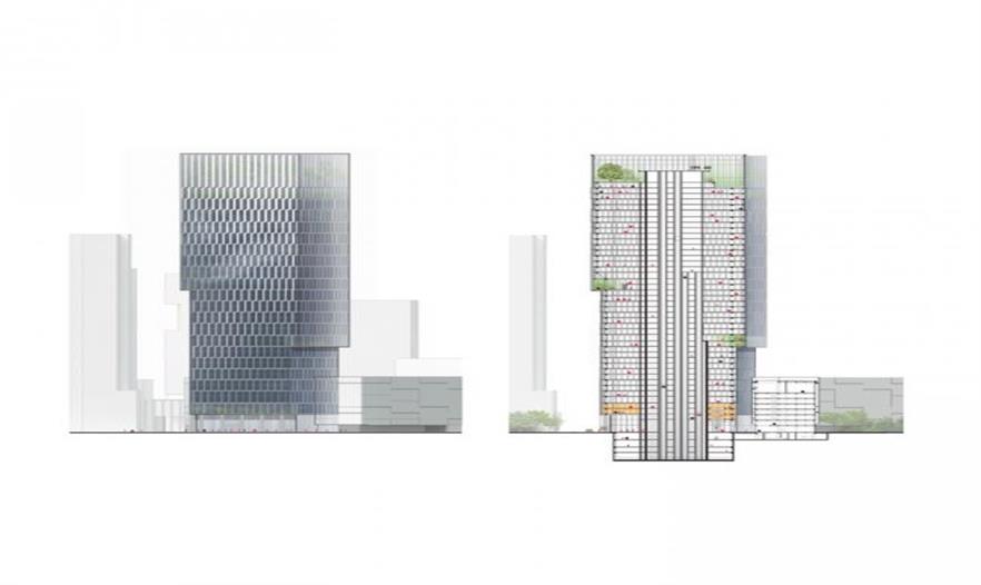 HENN 建筑事務(wù)所獲得了金蝶大廈設(shè)計競賽的第一名,該建筑將成為深圳金蝶軟件公司的總部建筑。這座44層的玻璃大樓是該總部的核心建筑,在兩座現(xiàn)有9層建筑之間具有不規(guī)則五邊形的平面。