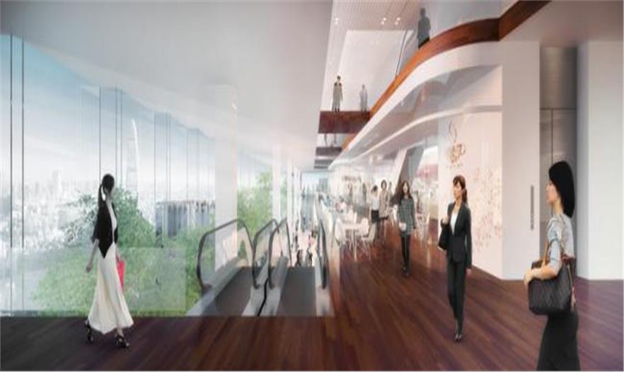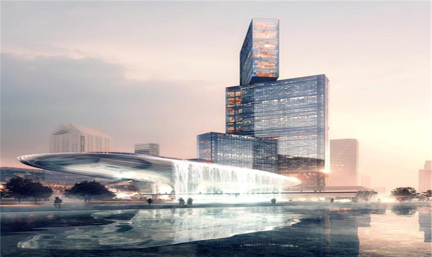 荔枝公園塔樓是一座300米高的辦公塔樓,在平臺(tái)的北邊。建筑由兩個(gè)互相交織的體量構(gòu)成。下方進(jìn)行了扭轉(zhuǎn),為建筑提供了朝向公園的視野,上方的體量懸挑可以看到場(chǎng)地的中央,平衡了 Nexus 大樓的體量。