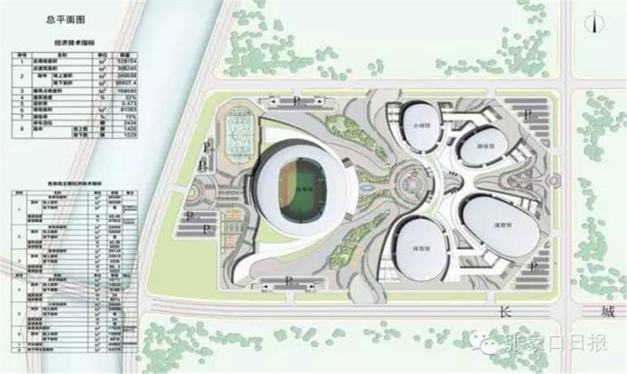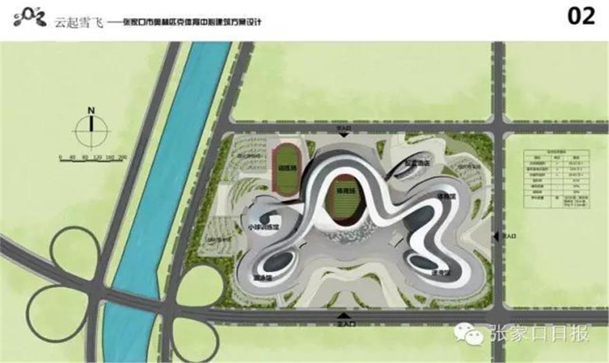 建筑以云起雪飛為概念,既呼應(yīng)了即將到來的2022 年北京冬奧會,又彰顯了張家口人民剛?cè)岵?jì)的性格。規(guī)劃布局將一場多館融為一體,以體育場為中心,四周向心布置體育館、游泳館、速滑館、小球訓(xùn)練館以及配套服務(wù)設(shè)施,猶如云彩的飄帶將各建筑體量串聯(lián)包裹。體育中心天際線隨各場館屋面高低起伏,既似綿延的山脈,又如飄逸的祥云,建筑群整體形象統(tǒng)一大氣而不失動感。飄帶環(huán)繞各場館,在用地南側(cè)自然圍合成流線型景觀廣場。通過差異化的立面幕墻設(shè)計,將中央的體育場凸顯出來,成為整個體育中心的視覺焦點,保證了城市主干道及市中心方向的標(biāo)志性形象。用地外圍結(jié)合景觀綠化,布置綠化停車場及休閑活動廣場。