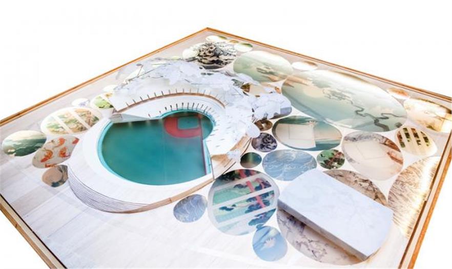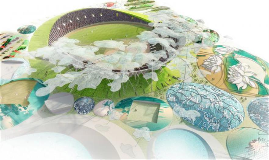這個(gè)體育場(chǎng),訓(xùn)練設(shè)施和其他相關(guān)項(xiàng)目被設(shè)置在了一片“柔軟的波浪形山丘中”,每個(gè)項(xiàng)目都占用了各自的橢圓形區(qū)域。這些不同大小的橢圓型區(qū)域根據(jù)三個(gè)子分類進(jìn)行了分層安排:自然景觀,如湖泊和花園,人造景觀,像體育場(chǎng)和通道,包括人行通道和車輛通道。