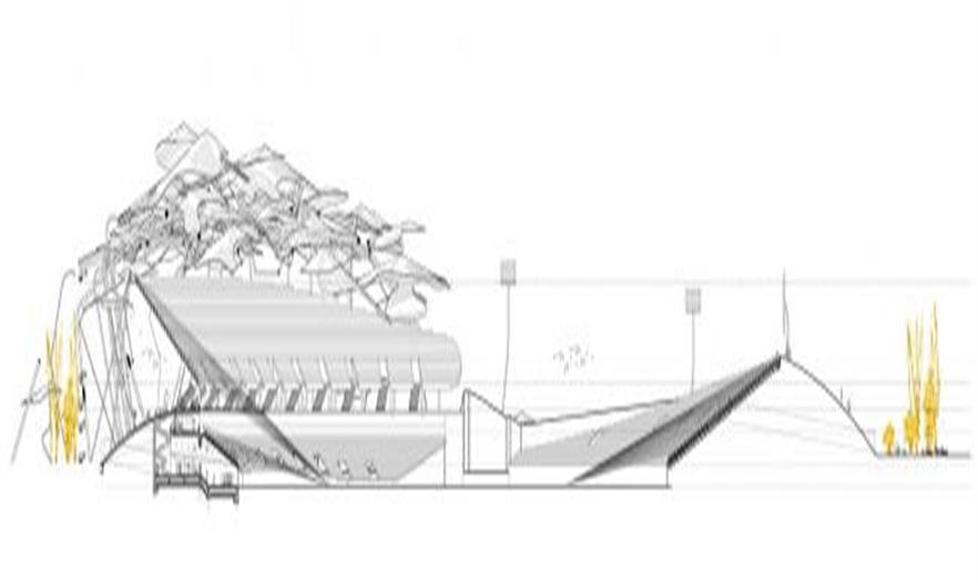 一條主要的人行通道穿過(guò)了整個(gè)場(chǎng)地,并通向主體育場(chǎng),體育場(chǎng)位于一座大的山丘上,下面是運(yùn)動(dòng)員和管理空間。這座山丘是用場(chǎng)地上的土壤建造的,這樣就不用再?gòu)耐饷胬吝^(guò)來(lái)了。此外,也不必再將場(chǎng)地上的土方運(yùn)出去,從而創(chuàng)造了材料的均衡。
