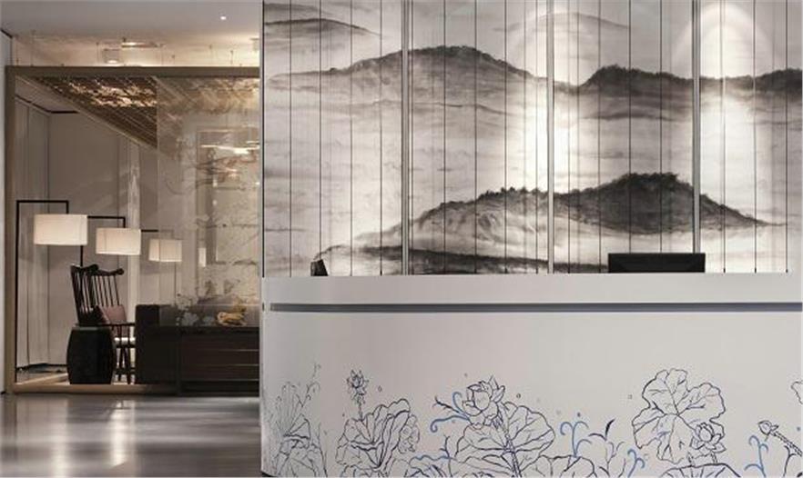 空間通過各種不同的水景連接,從涌泉水池到瀑布?jí)?,到跌水臺(tái)階最后再到達(dá)一個(gè)充滿禪意的無邊際水池。場(chǎng)地中的設(shè)計(jì)元素,如亭子、廊架、天花以及屏風(fēng),其靈感均來自于世外桃源故事中的桃花。