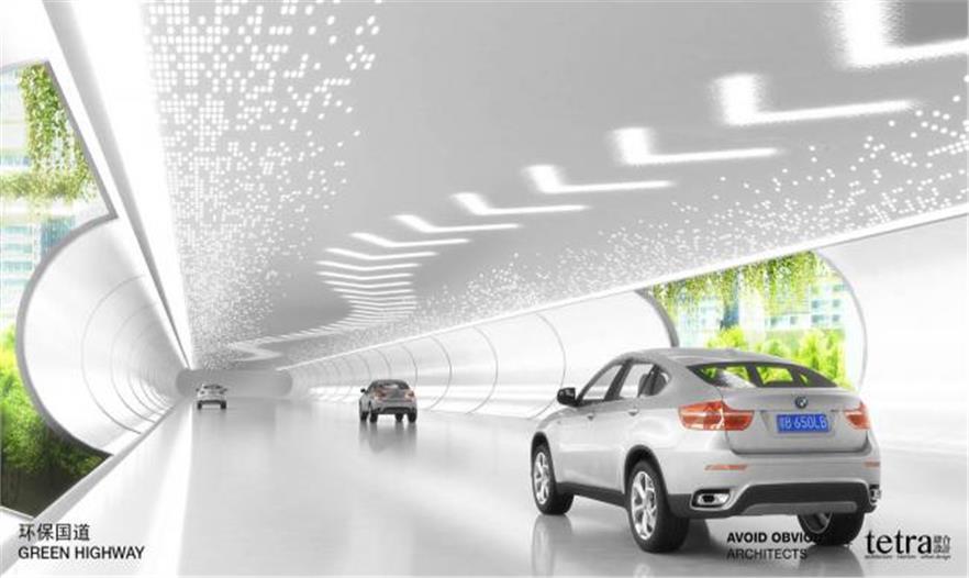在 AOA 和 TETRA的方案中,現(xiàn)存的12道高速公路沿著30千米的公路,分裂為兩個交織的4車道公路。將新的公路部分作為水平面,其上層和下層都利用為綠化和公共區(qū)域,形成了新的公共區(qū)域密度。地上部分在公路兩側穿行在建筑物間,使行人可以進入新的交通樞紐。沿著公路分布著新的藝術和設計文化中心。