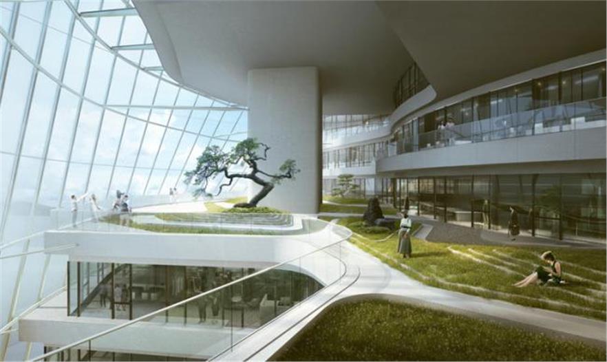 “欣賀設(shè)計(jì)中心”的設(shè)計(jì)以一個(gè)圓形中庭為軸心,六個(gè)大跨度空間發(fā)散型星狀布局,形成充滿力量感的骨架結(jié)構(gòu),其間辦公空間和綠色花園混合布置。在立體花園的外側(cè)懸掛著半透明的PTFE膜材,在炎熱季節(jié)起到遮陽(yáng)和通風(fēng)作用的同時(shí),也讓建筑看起來(lái)飄逸,輕盈,好像一層透薄柔軟的皮膚覆蓋在建筑骨架之上。馬巖松解釋?zhuān)?ldquo;我覺(jué)得有意思的是一棟內(nèi)部具有理性邏輯的結(jié)構(gòu)看上去卻有隨風(fēng)飄動(dòng)的感覺(jué)。”