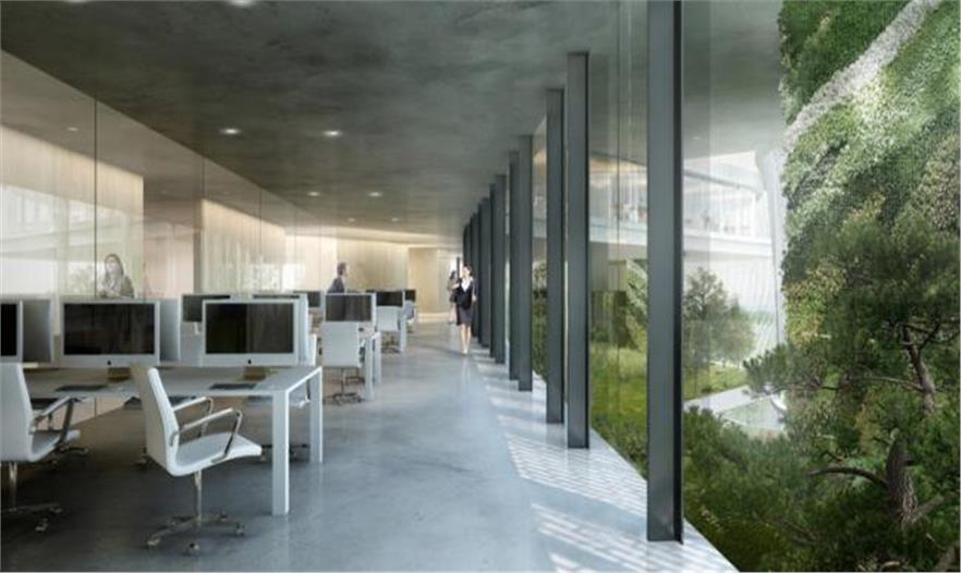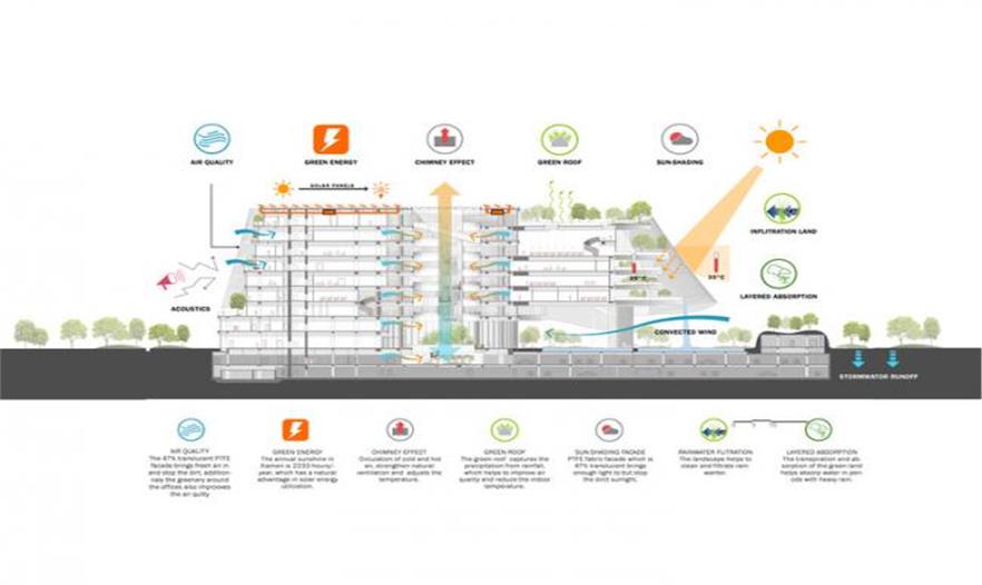 立體的花園讓地塊內(nèi)實(shí)現(xiàn)了100% 的綠化率。建筑立面采用特制的半透明遮陽(yáng)膜,設(shè)計(jì)透光率40%,既降低了建筑的太陽(yáng)輻射,又給辦公空間提供了充分柔和的自然光。樓頂采用了太陽(yáng)能發(fā)電板裝置,可滿足辦公樓日常運(yùn)營(yíng)所需的部分用電量。