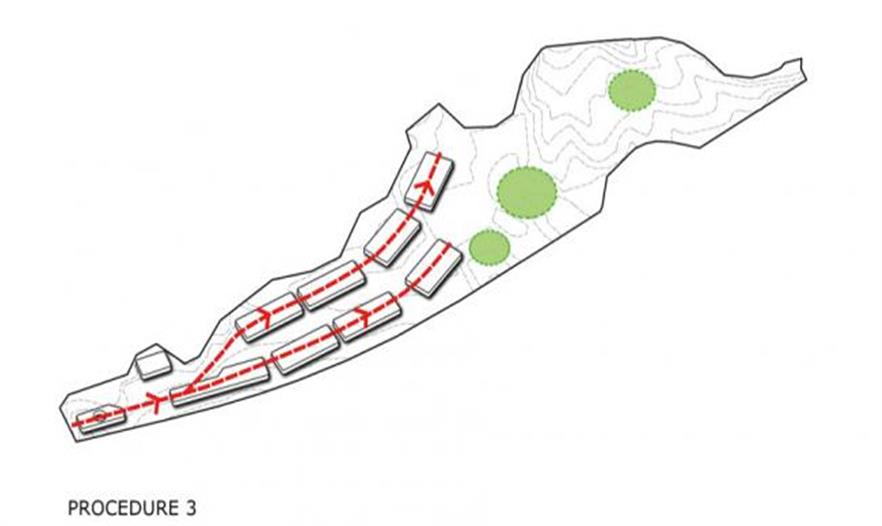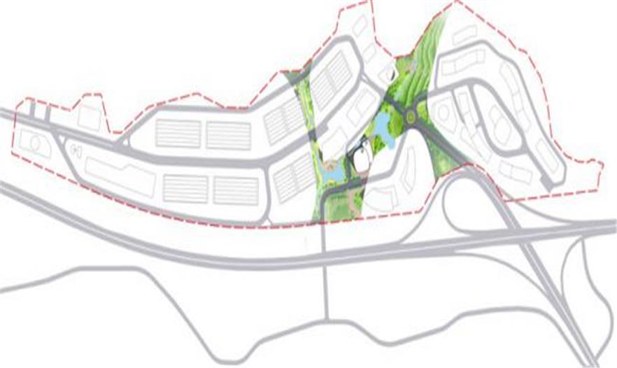 根據(jù)基地自然條件,本方案將基地西側(cè)平坦區(qū)域布置廠房。廠房區(qū)域按照建筑標(biāo)準(zhǔn)化、使用功能、工藝流程等進(jìn)行排布,從而形成了一條自西向東的流線,并將流線延長(zhǎng)至基地東側(cè)進(jìn)行功能組織布置。根據(jù)東側(cè)的地形、地貌形成了三個(gè)主要景觀節(jié)點(diǎn),并根據(jù)景觀節(jié)點(diǎn)與西側(cè)廠房共同形成了園區(qū)的整體設(shè)計(jì)。