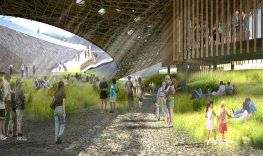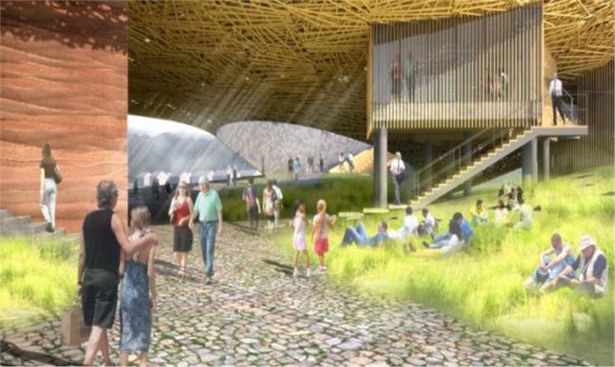 層次分明的地形地貌和翠綠的山巒在室內(nèi)空間形成了一幅美麗畫面,他就像一個(gè)打開的“劇院盒子”出現(xiàn)在廣場上,將這塊場地變成了一個(gè)內(nèi)外交互的表演舞臺(tái)。室內(nèi)/室外和景觀/舞臺(tái)之間的模糊邊界也消除了表演者和觀眾之間的心理界限。