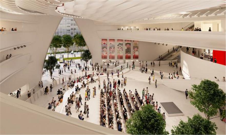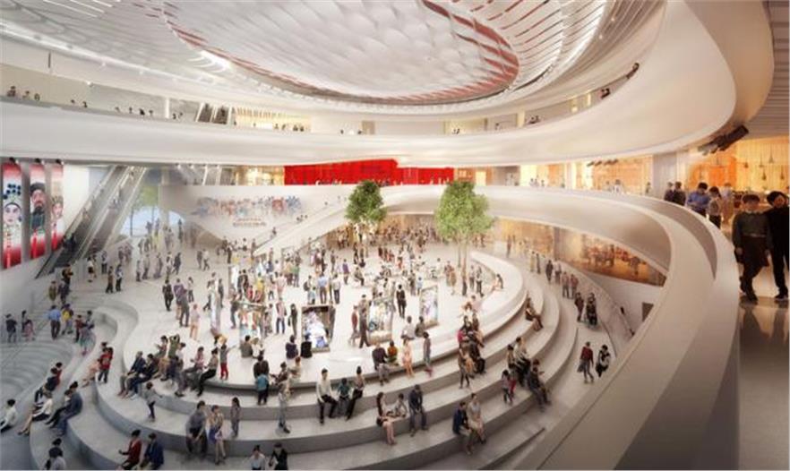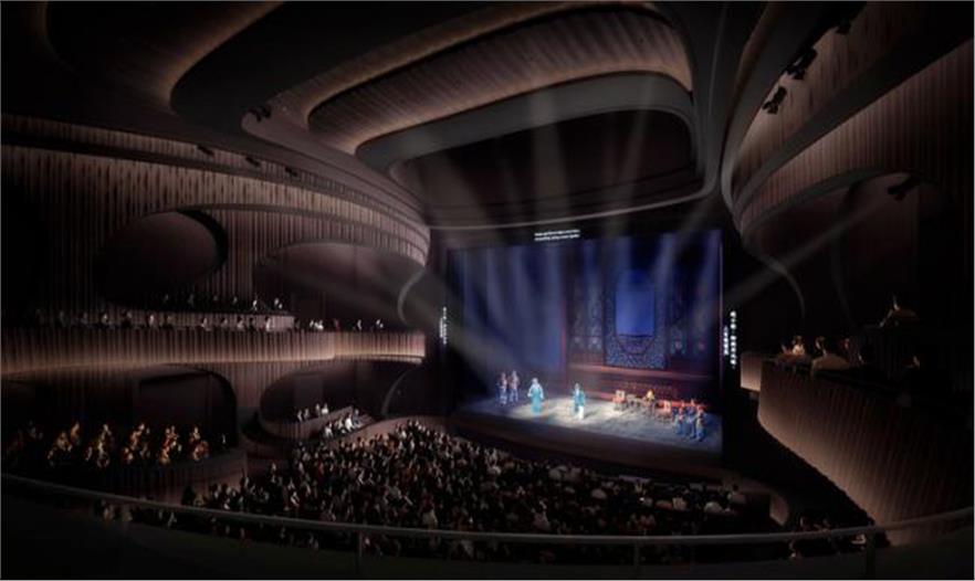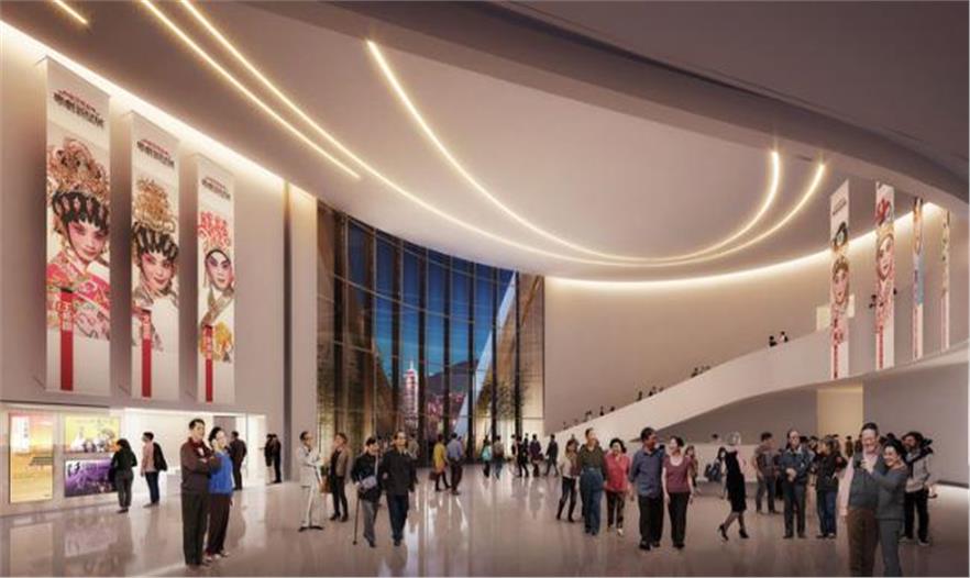 作為一個文化圣地,該項目包含了戲劇、藝術(shù)和沉思的各個空間,其設(shè)計靈感來自于“珠簾后的燈所發(fā)出的柔和光芒,”這照亮了面向街道的四個開口和建筑立面上的一系列燈箱。該中心的形成重新定義了中國傳統(tǒng)主題的特色文化區(qū)–主要由Foster + Partners 設(shè)計–表達了“氣”的概念和流通的曲線路徑及要素。