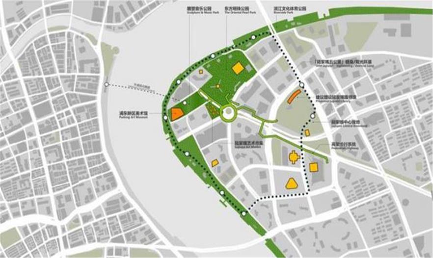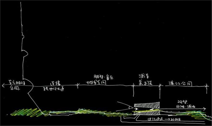 浦東美術(shù)館恰好處于這個新的公園系統(tǒng)里一個重要節(jié)點,它和東側(cè)鄰近的綠地一起把東方明珠公園和濱江的公園聯(lián)系起來。東側(cè)的綠地將成為從美術(shù)館延伸出的一個雕塑公園,同時也是舉辦音樂節(jié)、藝術(shù)節(jié)等重大戶外活動的草坪公園;西側(cè)美術(shù)館的夾層空間則將成為一個天然的大型“城市舞臺”,東方明珠是其獨(dú)特壯觀的舞臺背景。