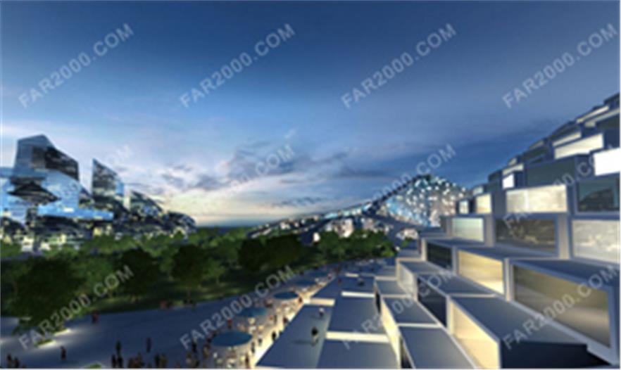 從遠(yuǎn)處看,島嶼的地形就像一座被照亮的山脊,但事實(shí)上這里的景觀是活生生的、具有功能性的居住空間,7座大廈形成了新城。重要的是,該項(xiàng)目模擬了自然山脈的特型,構(gòu)成了全面可持續(xù)的生態(tài)系統(tǒng)。