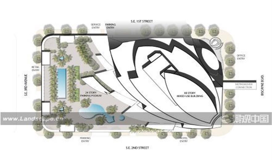 80層的One Bayfront Plaza坐落在邁阿密市區(qū)的中心位置,占據(jù)了兩個城市街區(qū)。該項目總面積400萬平方英尺,其中130萬平方英尺是A級辦公空間。此外還有一座850間客房的飯店、15萬平方英尺的零售空間和美國最高的觀景平臺之一。該項目的目標是取得LEED銀級認證。