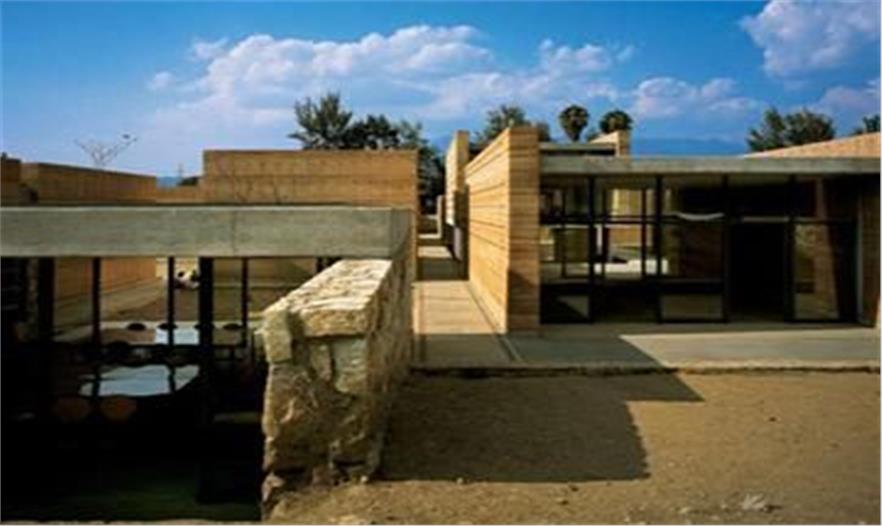 學(xué)校大門的設(shè)計(jì)采用了透視縮距法,從外面看顯得校門會(huì)比實(shí)際小。這種設(shè)計(jì)創(chuàng)造了視覺上的貝殼效應(yīng)。 庭院中石子路和墨西哥櫻桃樹的樹蔭營造了一個(gè)舒適的工作環(huán)境。坡地上種滿了易維護(hù)的植物,而吊竹草則使整個(gè)空間更像一個(gè)花園。藝術(shù)家弗朗西斯科•托萊多(Francisco Toledo)主張校園應(yīng)該被花園圍繞,從而成為一個(gè)生動(dòng)的整體。他在室外空間的設(shè)計(jì)上扮演了重要角色。